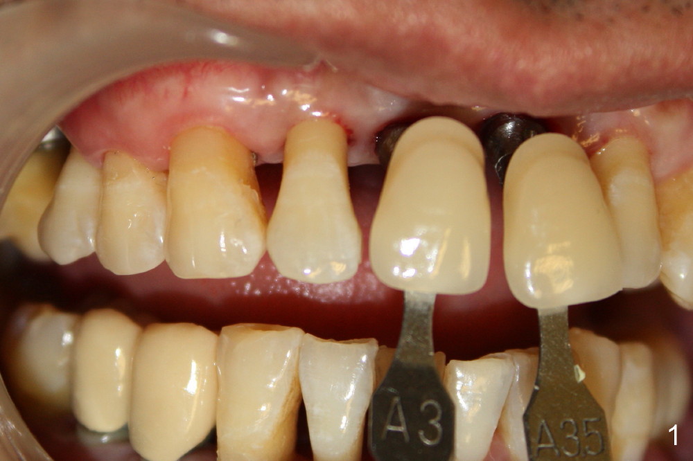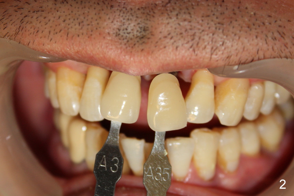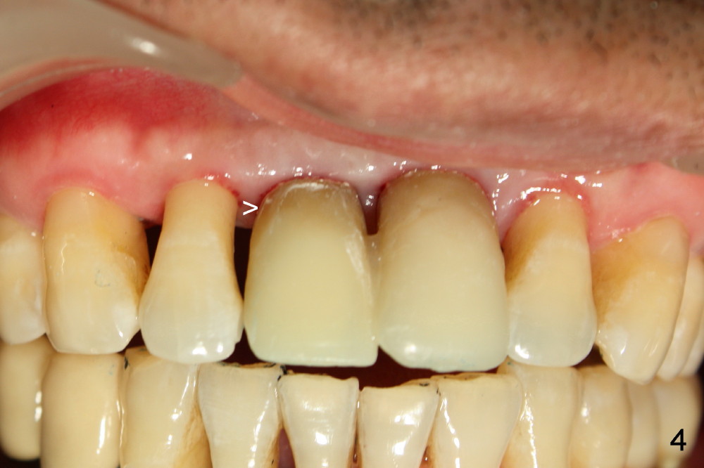 Pay attention to two distinct shades of the crown and root of the neighboring teeth (Fig.1,2). The root looks darker than the crown. The patient has severe periodontal disease.