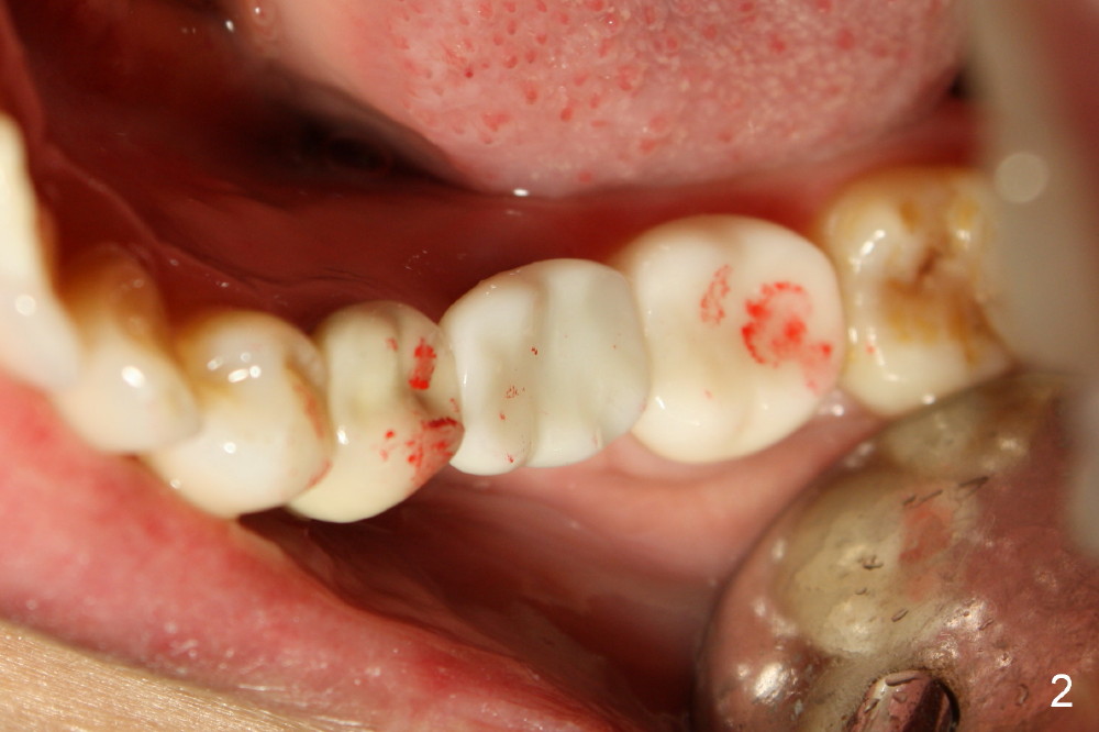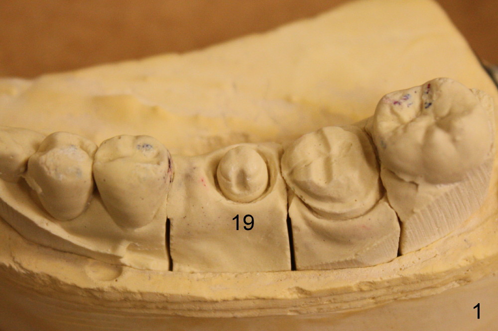 Fig.1 shows a model of #18 and 19 crown prep. #18 is a natural tooth, whereas #19 is an implant. In order to have less trauma from occlusion, the occlusal table should be narrow buccolingually for the implant crown (as shown in Fig.2). The occlusal contact should be lighter than that of the neighboring teeth as well.