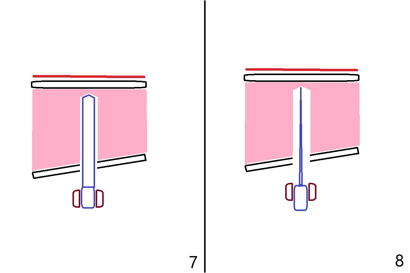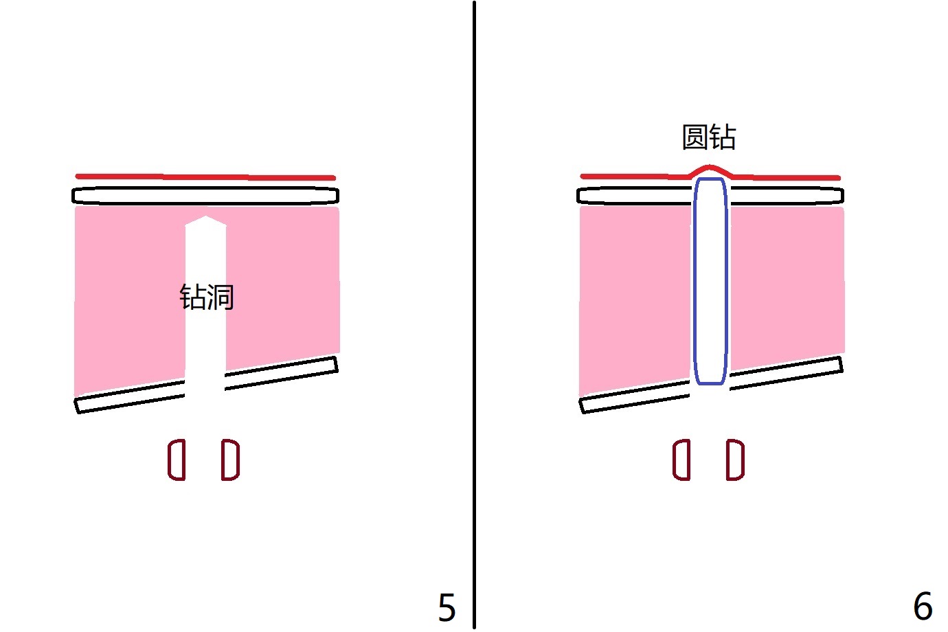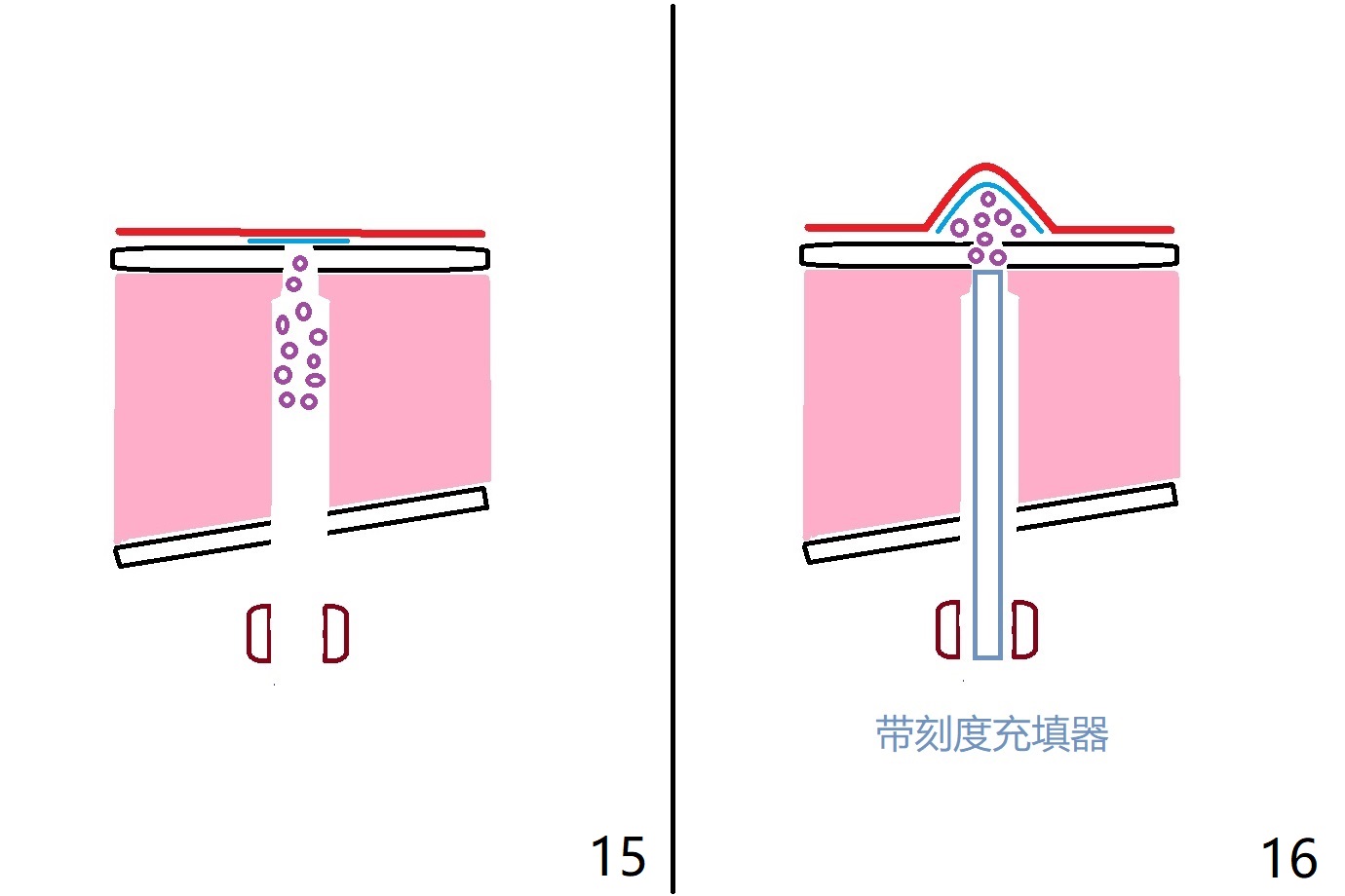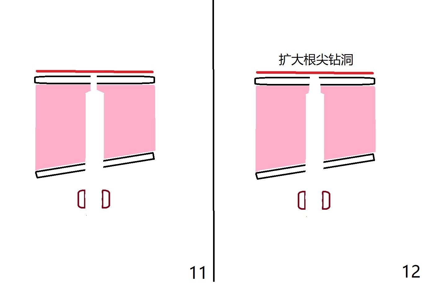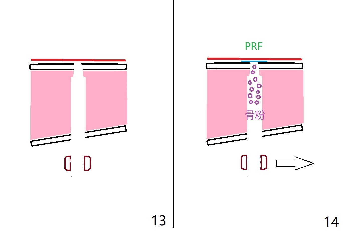图一显示上颌后牙牙槽骨,下有牙槽嵴,上有窦底(均是皮质骨,黑色),两者之间是松质骨,窦底上面是窦膜(红色)。上颌窦提升目的是让植体卡在两个皮质骨(图二),增加稳定性。植体必须穿过窦底,但是不必太多,否则窦膜容易破。窦膜提升最有效方法是上推骨粉(紫色圆圈)。导板钻洞开始最重要步骤是使用平钻(bone trimmer)磨平斜行的牙槽嵴(图三:白色),先锋钻(蓝色)在金属圈(棕色)引导下不会偏移,与图四对比。逐级钻孔至窦底下1毫米(图五),然后徒手或者导板使用圆钻头穿破窦底(图六),前者可能失去方向感,不容易掌握深度(软组织干扰)。用于导板的圆钻偶尔与金属圈不匹配,不能使用。在这种情况下,选择最细钻头,但是比最后钻头长一号(比较图七,八)。缓慢钻洞,观察金属圈与钻头圆柱端之间关系(图九,十),同时感受突破感,越细钻头,越容易感到突破感。即使穿破窦膜,也容易修复(下面讨论)。一旦窦底穿破(图十一),使用大号钻头扩大根尖钻洞,控制深度(图十二),然后放置PRF膜(图十四:蓝线,很滑,容易进入上颌窦),修复明显或者潜在窦膜破裂;放入骨粉(紫色圆圈)。使用带刻度的充填器上推骨粉(图十六)。再放置一些骨粉(图十七),然后利用报废植体(图十八:绿色)尖端自功性将根尖自体骨质(图十七:箭头)也推往上颌窦(速度15-50RPM),仿佛十分安全可靠。一旦骨粉推到上颌窦,可以使用常规钻头扩大根尖骨质,放置正式植体。如果窦底是斜行的(图十九),可以请实验员设计钻洞长轴(图二十:白色)与窦底垂直,钻头,植体容易穿过窦底,而不容易破坏窦膜。