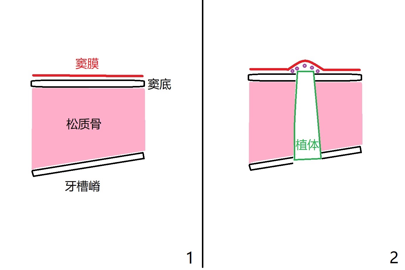 图一显示上颌后牙牙槽骨,下有牙槽嵴,上有窦底(均是皮质骨,黑色),两者之间是松质骨,窦底上面是窦膜(红色)。当骨高度不足时,上颌窦提升目的是让植体卡在两个皮质骨(图二),增加稳定性。植体必须完全穿过窦底,但是不必太多,否则窦膜容易破。窦膜提升最有效,安全方法是上推骨粉(紫色圆圈)或者水。牙槽嵴,窦底不平是手术困难原因,初学者选择窦底平的病例。而牙槽嵴不平解决方法....