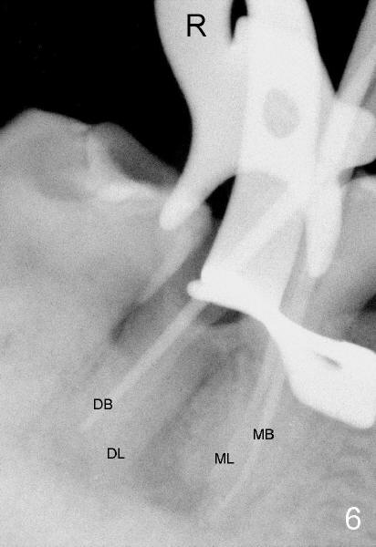On the second appointment, the buccal wall is fractured (Fig.5: B).  Visibility improves.  Straight access is obtained, particularly mesially, but DL orifice is still not found.  So D canal appears to be the only canal distally.  It is further debrided with 40/.04 file.  PA is taken when master cones are inserted (Fig.6).  This time DL root is quite obvious.