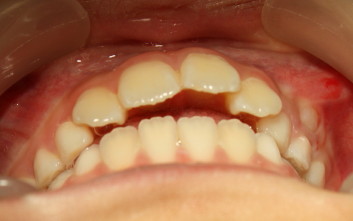 一年半后,前牙开合畸形更厉害了(图五),刚萌出的上门牙(U1,2)与下前牙(L)没有接触,另外一颗门牙长得歪歪扭扭(U3)。一年后(小孩九岁时),上下牙之间缝隙更大了(图六),总之,口腔坏习惯坏处多,应该早期纠正。