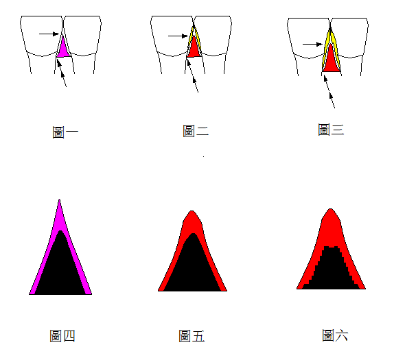 圖四是圖一的放大,顯示正常牙齦結構,牙齦深部是牙槽骨(黑色),環形包繞牙齒。牙齦炎時(圖五)牙槽骨沒有明顯的變化,而牙周炎時(圖六)牙槽骨好像被蟲子吃掉似,發生水平和或者垂直性吸收,牙齒逐漸鬆動。