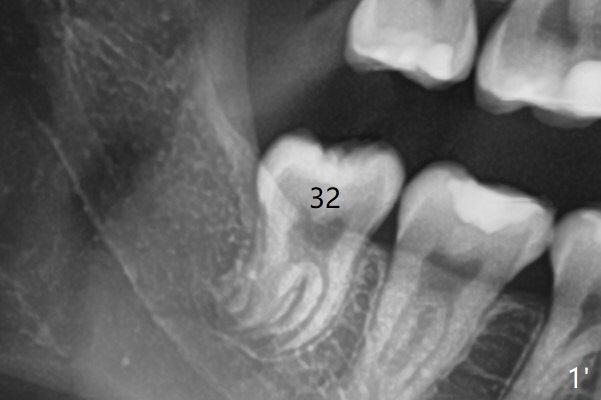 19岁女抱怨右下智齿远中龈下食物坎塞,不希望拔除,因为缺牙太多:先天性缺失一个下切牙,为了矫正又拔除4个双尖牙(图一)。临床检查32号牙远中牙龈覆盖(图二:*),而17号牙萌出不多(图三),没有食物坎塞史。局麻下,使用Diode Laser (Picasso)切除牙龈直到智齿远中咬合面暴露(图四)。术后突然意识到为了防止牙龈重新覆盖,必须做crown lengthening,也就是切除远中骨质(图五(黑色),与图一’对比),是吗?随访时利用Shining口扫记录,拍摄角度好。