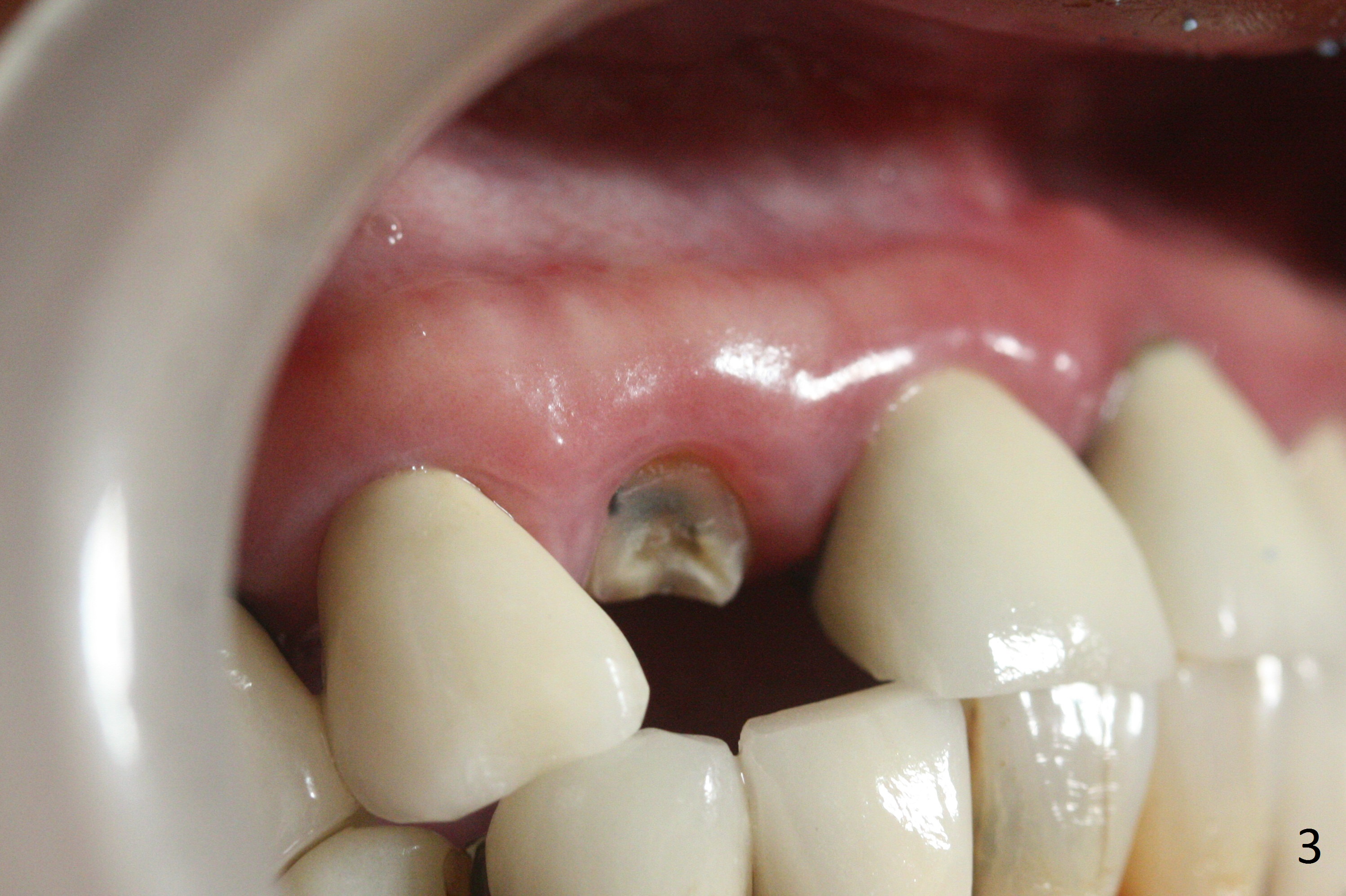 In fact the residual root (Fig.3) is easy to remove. A 3.8x16 mm implant is placed (Fig.4 (with 2 mm buccal gap)) at the level as planned (Fig.2). Insertion torque is acceptable. After placing a 4.5x5(3) mm gold-coated abutment and allograft (Fig.5), an immediate provisional is fabricated (the existing crown is lost). The patient is pleased with the quick, painless procedure.