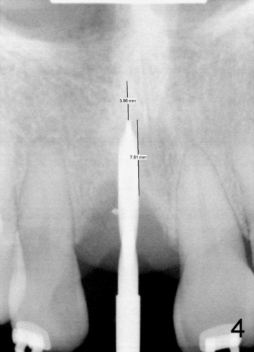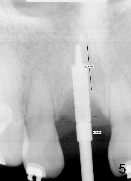 Osteotomy starts in the palatal aspect of this shallow socket with 2 mm pilot drill (Fig.4). New bone is gained 7.61 mm; another 3 mm is to be planned for primary stability.