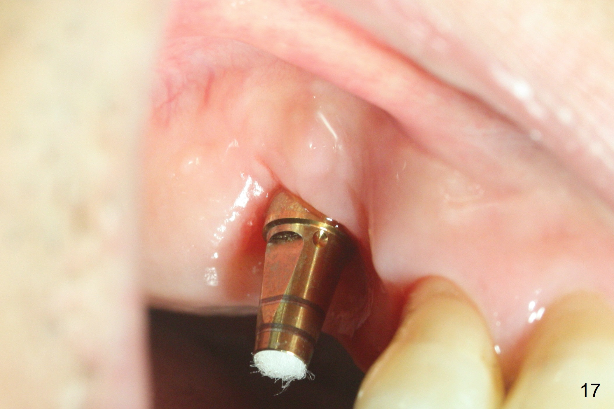 The distopalatal portion of the periodontal dressing dislodges 10 days postop. It appears after removal of the remaining dressing that PRF membranes has dissolved, while the remaining buccal and septal gingiva is healing (Fig.9). The wound leaves open for secondary healing.