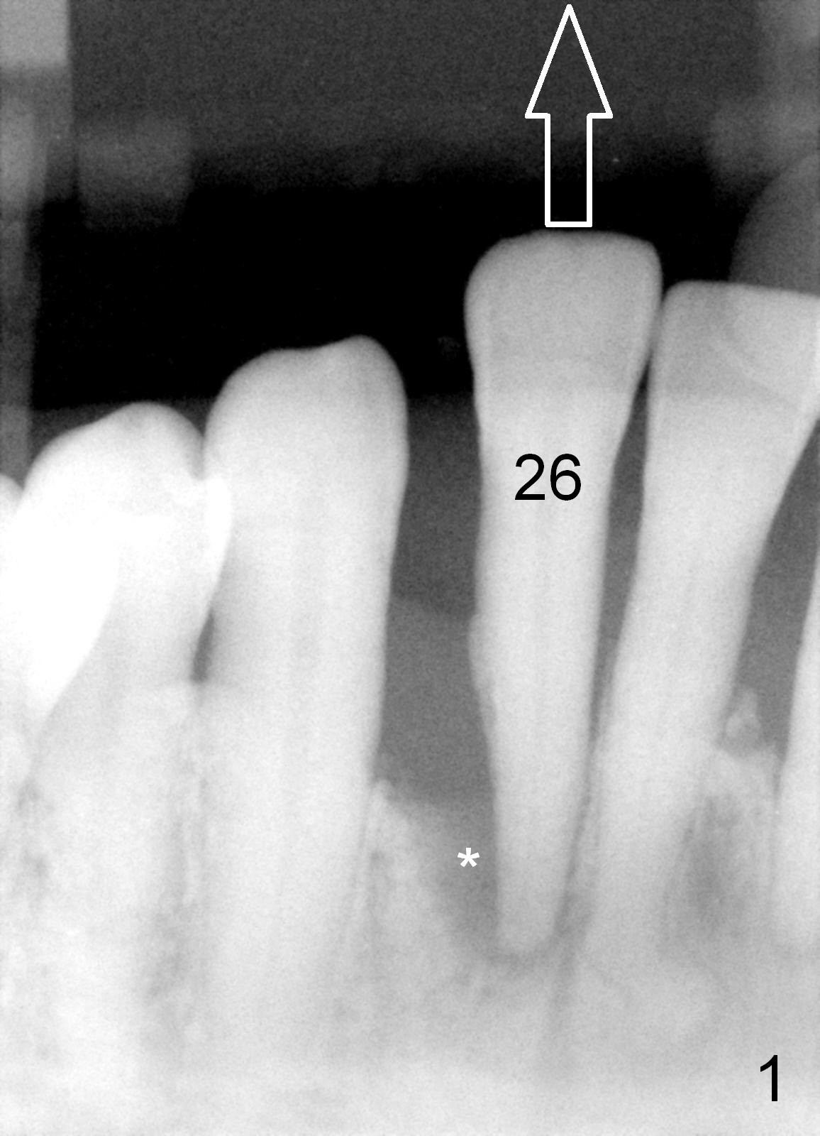 A 65-year-old lady has history of poliomyelitis and use of injection osteoporosis medicine. The tooth #26 is periodontally affected (Fig.1). Since the sensor is not placed deep enough (or there is plenty space above (Fig.1 arrow)), it is difficult to design implant treatment plan (Fig.2). PA has to be taken immediately pre-operatively for precise design.