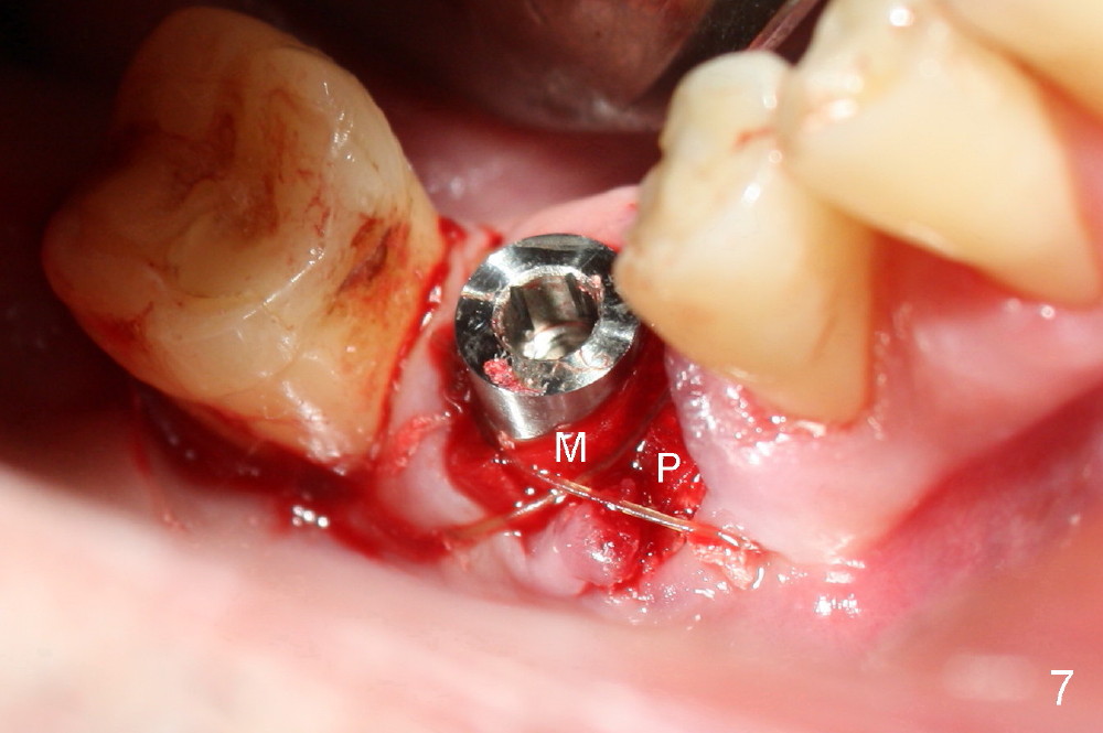 As to where to place an implant, we try to engage the largest tap (8 mm in diameter) into the mesial socket without binding. The buccal plate of the mesial socket is missing. It is risky to extend osteotomy in the mesial socket. Besides, the septum (Fig. 4 S) is not as tall as the distal socket (D). It appears that the distal socket is the safest place to place an implant. Furthermore, no drill is used for distal osteotomy. Instead two osteotomes (3.5x15 and 4x15 mm tapered osteotomes) are used to expand the distal socket with intention to push the septum mesially. Since the bone density is high, the osteotomes seem not to work as effectively as expected. Then a 4.5x17 mm tap is placed at the depth ~ 14 mm with stability (Fig.5). Finally a 5x14 mm tissue-level implant is placed with insertion torque >60 Ncm (Fig.6). Allograft is placed in the mesial socket and buccal aspect of the distal socket, followed by insertion of collagen plug and membrane (Fig.7). After insertion of an abutment (Fig.8 (taken 6 days postop) *), perio dressing (P) is applied to cover the wound. There is no postop paresthesia.