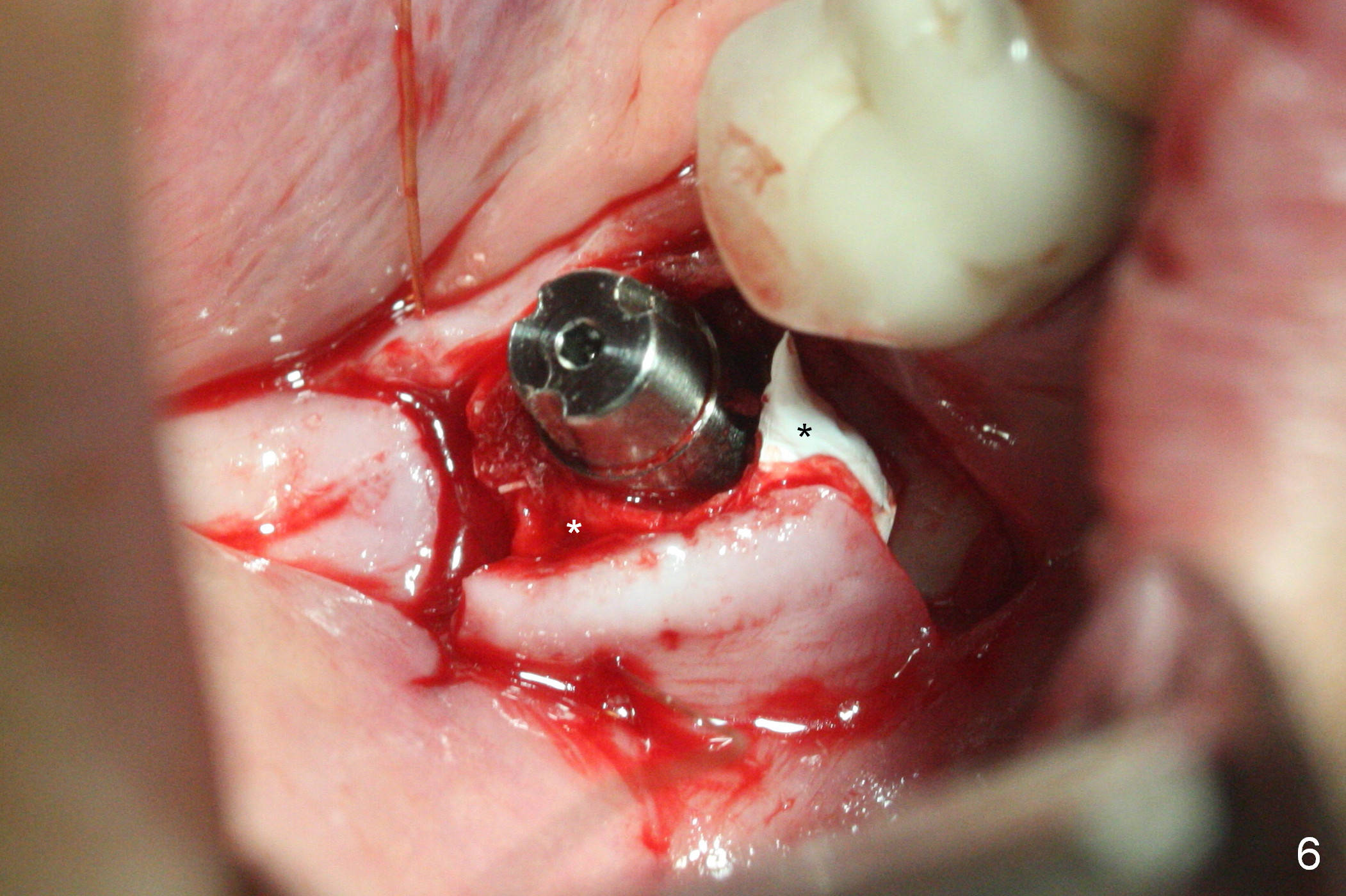 Initial osteotomy at the site of #31 using 2 mm pilot drill for 11 mm appears to be distal by 2-3 mm (Fig.1, Fig.10 A (circle, occlusal view of the edentulous and dentate (#29 and 30) areas)). Lindamann bur is used to move the osteotomy (Fig.8 white rectangle, Fig.10 B). It seems that the osteotomy returns distal as the osteotomy increases (Fig.2 (5x17 mm tap), Fig.8 arrow, Fig.10 C (green circle)). It appears to be late to change; a 5x17 mm tissue-level implant is placed with > 60 Ncm (Fig.3-5). The buccal and lingual rough surface of the implant (Fig.5 *) is covered by autogenous bone/Osteogen and Collagen Dressing (Fig.6 *). After suturing (Fig.7), periodontal dressing is applied around the abutment (Fig.5 A (4.5x3 mm)).