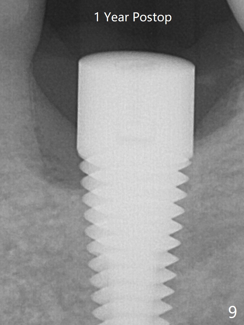 So does the definitive implant (Fig.6, 25 Ncm), but it is placed low. The gingiva looks healthy 13 days postop (2nd placement (without paresthesia)). A healing cap will be placed for restoration ~ 3 months postop. Due to coronavirus and prolonged placement of a healing abutment with poor oral hygiene, the buccal gingiva of the implant is erythematous 1 year postop with bone loss (Fig.9). Sticky bone seems to be necessary. A 6x5 mm abutment with slots will be placed to hold periodontal dressing in place.