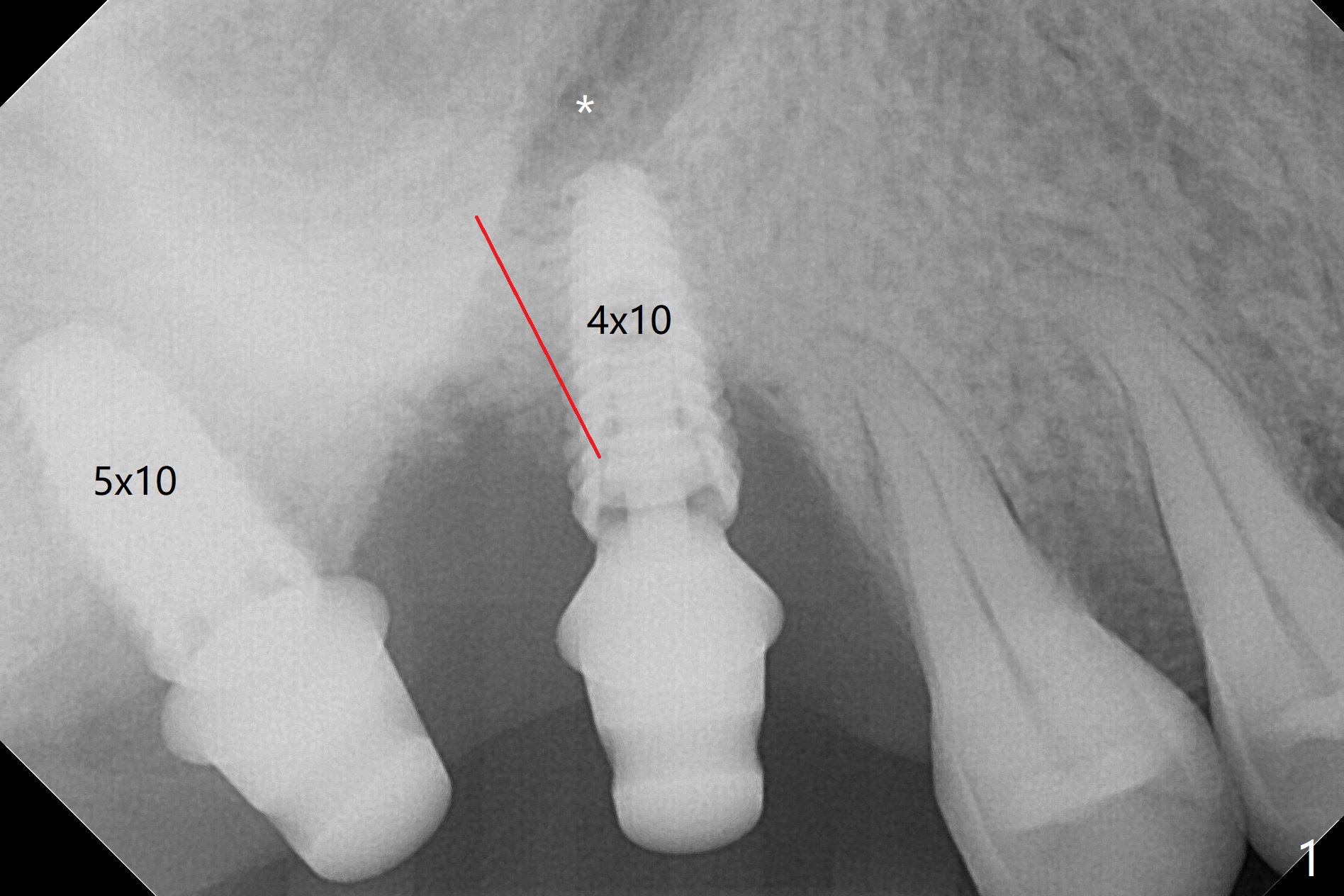 After use of 2.2 mm IS drill, DIO parallel pins are unstable at #2 and 3, partially due to shallow osteotomy. PA is not taken with parallel pins. When dummy implants are placed, the axis at #3 is noted; but instead of moving the apical end of the osteotomy distal (Fig.1 red line), the coronal end is moved mesial. By the time definitive implants and abutments are placed, the axis of #3 is parallel to that of #4, but close to each other (Fig.2,3). Orthogonal panoramic X-ray shows that they are critically close (Fig.4). If PA were taken with parallel pins after initial osteotomy, correction would be easy. The patient is doing fine postop without pain or nasal hemorrhage. There is no thread exposure 11 months postop (Fig.5). The abutment screw at #3 is retightened 7.5 months post cementation (Fig.6 (poor crown/implant ratio)).