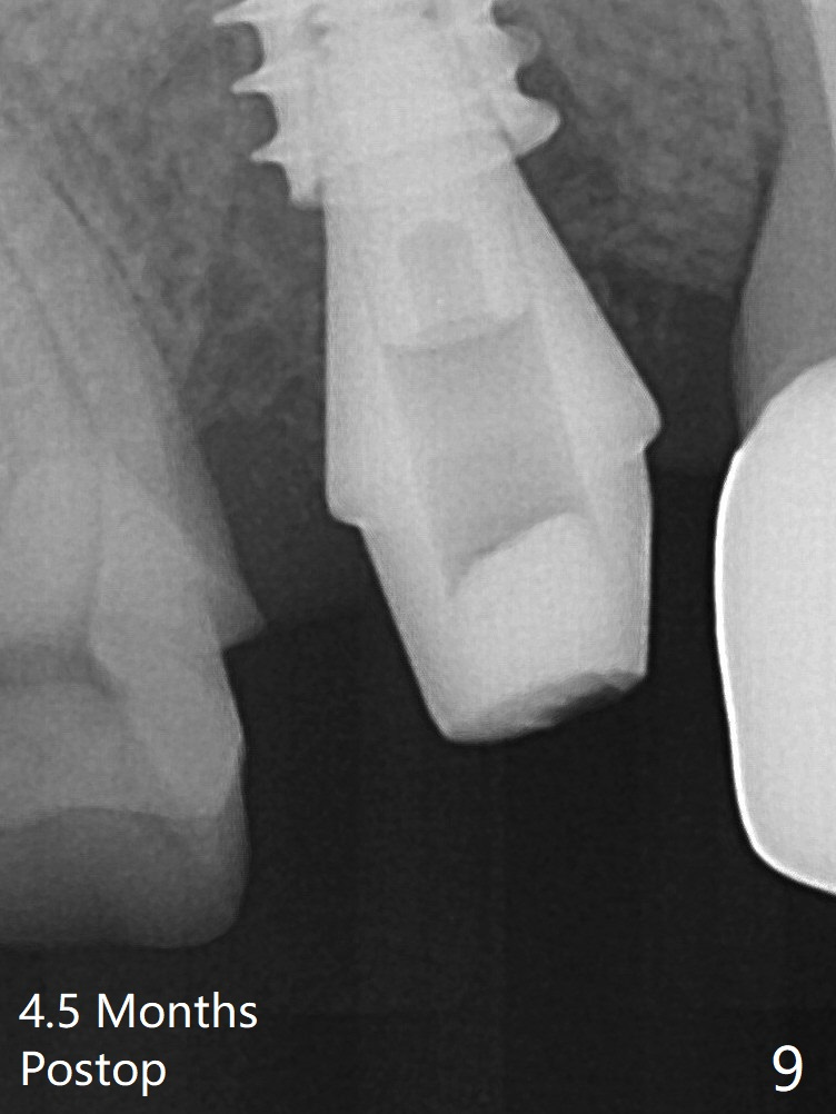 To reduce the gap and periimplantitis, a 5x11 mm IBS implant is placed with insertion torque > 50 Ncm after further osteotomy using Magic Drills (Fig.4). Following placement of 5.5x4(4) mm abutment (A), a splinted provisional is fabricated at #3 and 4. The provisional is stable 3 months postop (Fig.7). Bone graft appears to remain between the implant fins (arrows). The bone density of the bone graft between the implant fins increases 4.5 months postop (Fig.9). The bone density appears to reach the normal value (same as that of the nearby bone) 1 year 3 months post cementation (Fig.11).