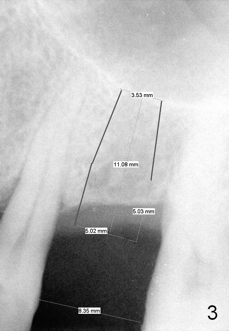 A 58-year-old man has multiple missing teeth including #14; the remaining teeth has sign of occlusal trauma (bone loss, Fig.1 arrowheads). The mesiodistal space of #14 is 8 mm (Fig.2). It appears that a 4.5x14 mm implant is appropriate for the site with sinus lift. Scalpel will be used to initiate osteotomy and bone expansion in case the bone density turns out to be low. To prevent the sinus membrane perforation, use a shorter implant (11 mm, Fig.3).