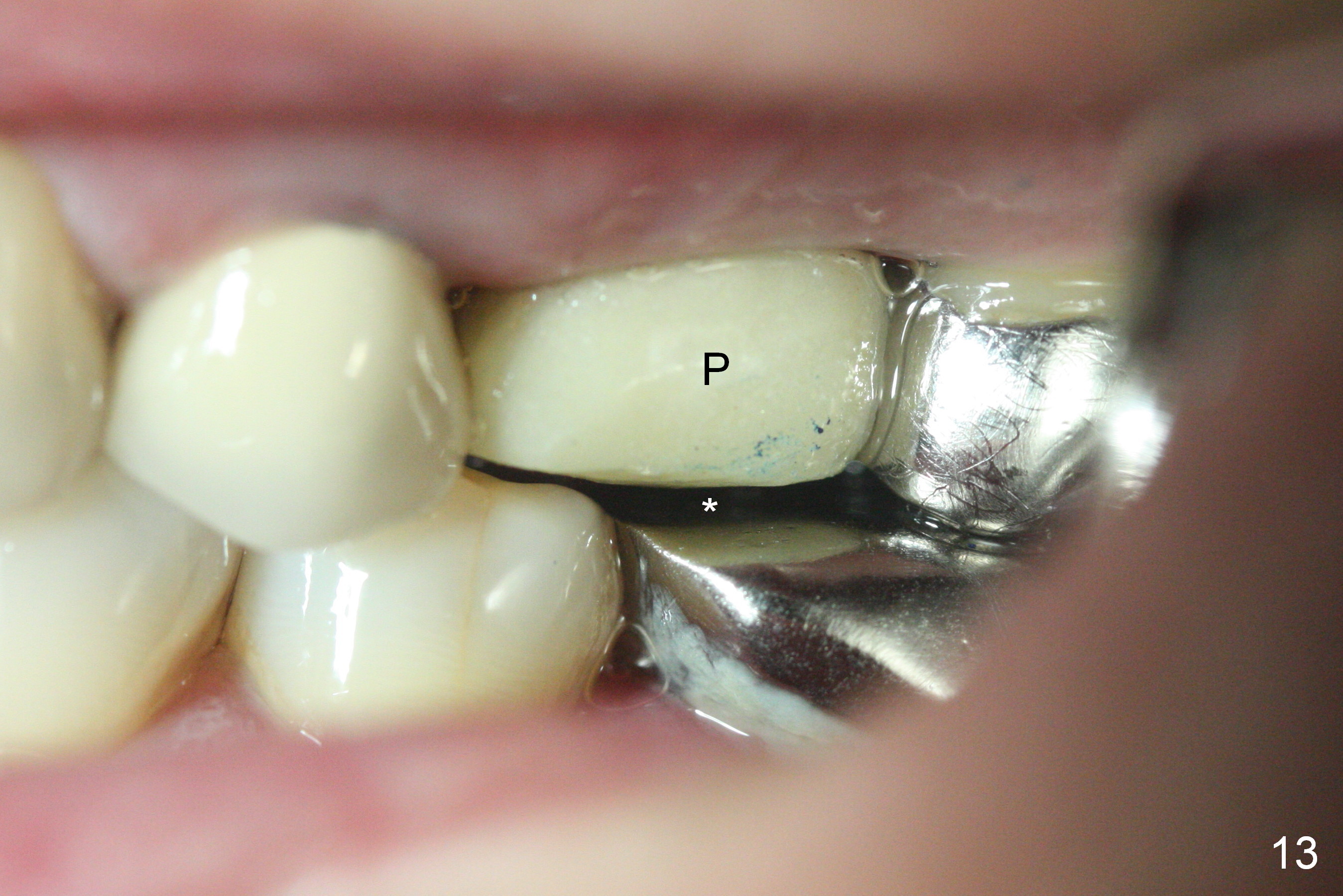 The patient is doing well 9 days postop.  The immediate provisional is loose and over-sized.  It is removed for trimming and reline; the socket and bone graft (Fig.8 *) are healing.  It appears that an angled abutment is required next time of provisional revision.  When an angled abutment is being placed 23 days postop (Fig.9), it appears to wiggle the implant due to its long leverage.  Instead a healing abutment is placed.  The implant is unstable 4.5 months postop with seemingly excessive bone-implant gap (Fig.10 <).  The 5.5x9 mm implant is removed.  A 5x17 mm tap is used to change the trajectory and sinus lift, followed by 6x17 one (Fig.11).  Finally a 6x14 mm tissue-level implant is placed with insertion torque > 50 Ncm (Fig.12; vs. <20 Ncm (Fig.7,10)) and improved trajectory.  An immediate provisional is fabricated to prevent the mesial drifting of the tooth #15 (Fig.13 P (*: occlusal clearance)).  By using the taps and placing the longer implant, the sinus lift is more obvious (compare Fig.10 and 12 (*)).  Sinus lift remains evident 3.5 months postop (Fig.14) with apparently osteointegration (Fig.15).