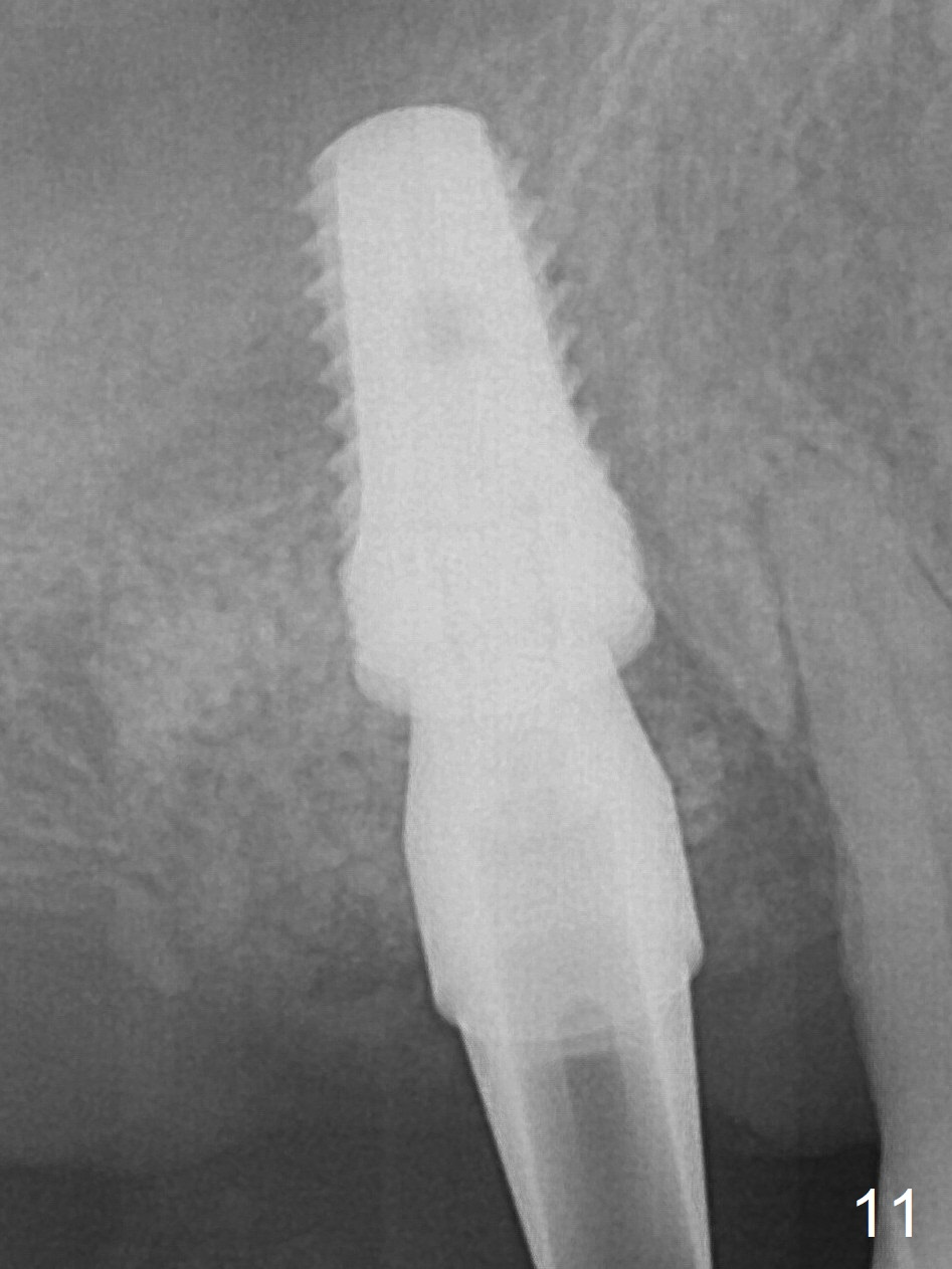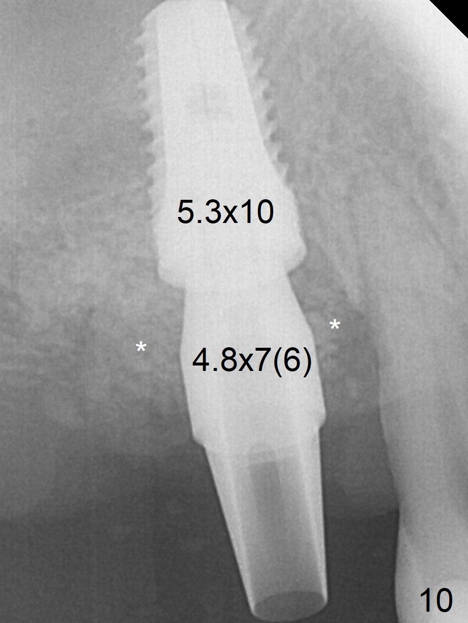 After extraction of the tooth #3 (Fig.1,2), the palatal socket (P) is as wide as the buccal one (B; Fig.3,4 (socket impression)), as compared to the roots), suggesting bone loss is more severe palatally than buccally. There is a circular area in the buccal slope of the palatal socket, in which the bone looks thin (purplish: presumably the sinus membrane underneath, Fig.5,7 (blue circle)). It appears that the palatal slope of the buccal socket (Fig.6, 7 red dashed line) is the most appropriate site for osteotomy (Fig.8). Prior to inserting 5.3 mm tap drill (Fig.9), the mesiopalatal region of the osteotomy (corresponding to the blue circle in Fig.7) perforates without sinus membrane tear. A small piece of Osteogen plug is placed in the perforation before inserting a 5.3x10 mm SM implant (Fig.10,11). Following placement of another piece of Osteogen plug in the palatal socket and of a 4.8x7(6) mm abutment, mineralized cortical and cancellous bone is placed (*). Collagen plug and an immediate provisional are used to close the socket opening. CT taken 11 months post cementation shows that the implant is placed within bony boundary, although buccally (Fig.12 B). Bone graft seems to heal in the sinus (Fig.13 (sagittal section),14 (coronal section) white * (Osteogen plug) and in the socket (brown * (allograft and Osteogen)).