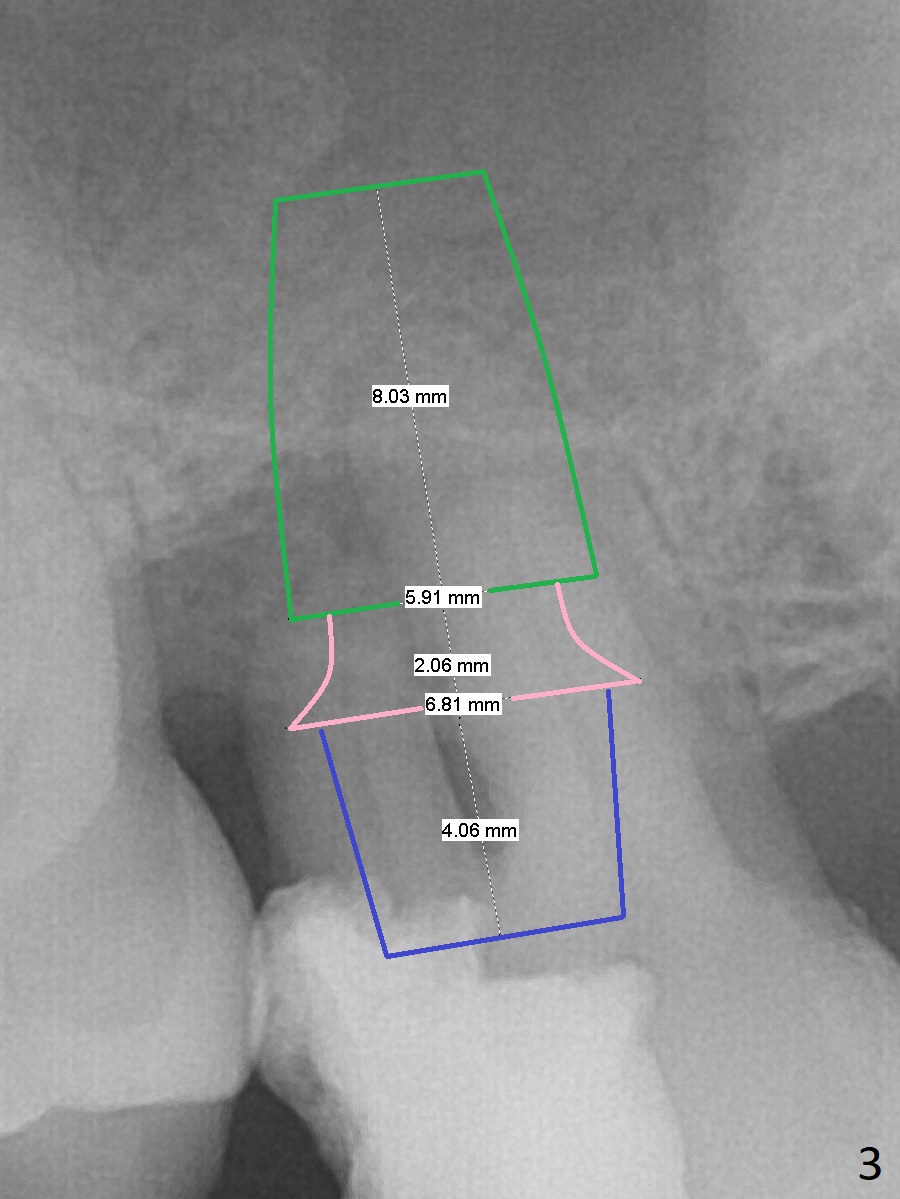 A 47-year-old man will return for #15 extraction and implant (Fig.1). Bone loss seems to be the most severe around the mesiobuccal root (Fig.2 *), from which the osteotomy should stay away (Fig.3). Take PVS impression for the sockets. Use Tatum osteotomes for sinus lift.