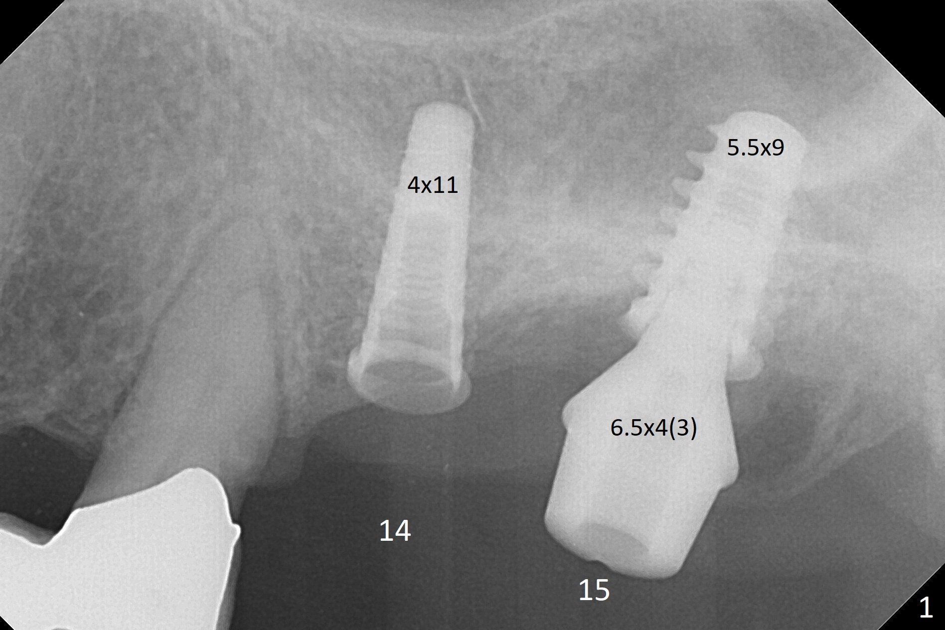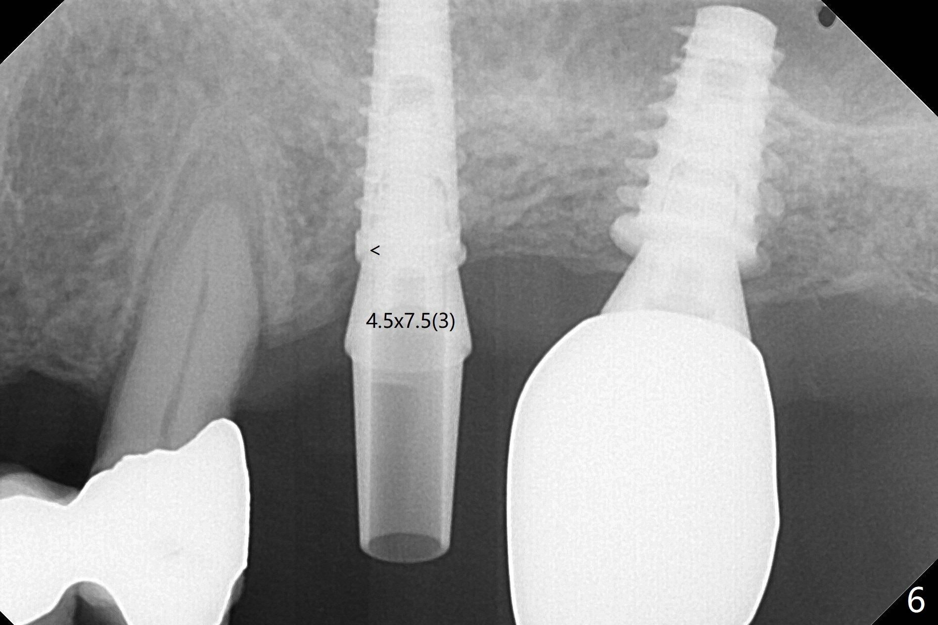 Due to irregular shape of freshly extracted socket at #15, control of depth is difficult. The sinus membrane is perforated after use of bone spreader, probably associated with drills longer than expected. SM taps (5.0 and 5.3 mm) do not achieve stability. When a 5.5x9 mm IBS dummy implant is inserted, initial stability is obtained (Fig.1). Osteotomy at the edentulous area of #14 is uneventful with insertion of a 4x11 mm dummy implant (without involving the sinus floor apparently clinically as well, Fig.1). After adjustment of trajectory, a 4x11 mm definitive implant is placed at #14 with ~ 35 Ncm, while a 6x9 mm implant is placed at #15 with ~35 Ncm (Fig.2 (*: Vanilla Graft with Osteogen)). Periodontal dressing is applied around the abutments and neighboring teeth. There is mild oral and nasal hemorrhage postop. In fact the patient has history of stroke with oral Plavix intake. The medicine stops 4 days preop and is advised to resume after hemostasis is achieved. The patient returns 3 months postop (Fig.3). After changing abutments to 5.5x5.7(3) mm, impression is taken. The crown/abutment at #14 is loose 1 year 10 months post cementation. After use of 5.5 mm profile drill, the crown/abutment is reseated, but the seating is incomplete (Fig.4 <) because of contact of the abutment with the mesial crest (*). A larger profile drill does not help (Fig.5). When a narrower abutment (4.5x7.5(3) mm) is torqued, it appears to be completely seated (Fig.6). After distal surface adjustment of the abutment, impression is re-taken. There are 3 other unfavorable conditions: poor crown/implant ratio and trajectory and #18 missing. The abutment at #14 must have been prepared for parallelism before impression. Return to Upper Molar Immediate Implant, Prevent Molar Periimplantitis (Protocols, Table), Armaments No Deviation Prevent Screw Loosening Xin Wei, DDS, PhD, MS 1st edition 11/28/2017, last revision 02/23/2021