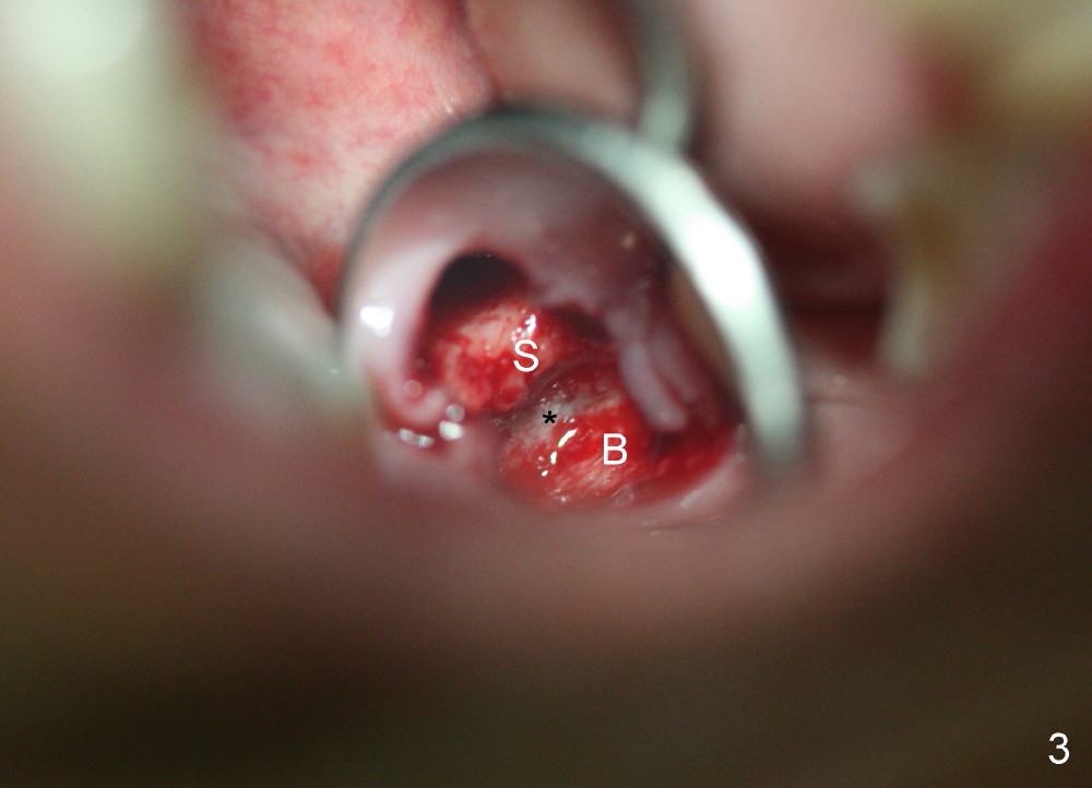 The septum is narrow buccopalatally (Fig.3 S). It is difficult to make initial drill penetration at the top of the septum. It appears that the septal bone height is limited (Fig.10a). Preop PA shows that the sinus floor is lower than the root apices (Fig.1). This is a typical sign of sinus floor ditching in between the apieces.
