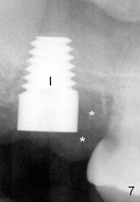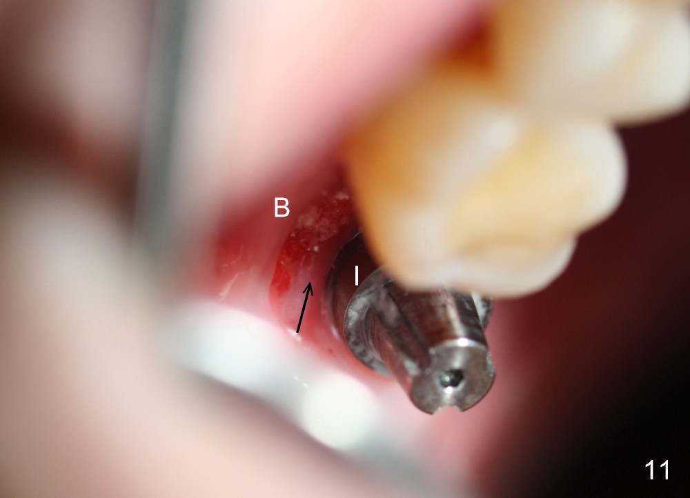 The patient returns to clinic 1 month postop, because of loosening of the provisional. The buccal socket appears to have epithelium (Fig.11 B); the keratinized gingiva has apparently moved (arrow) to cover the buccal surface of the implant (I). The long abutment, which was used for retention of the immediate provisional as well as the graft and collagen dressing, has finished its mission. It is changed to a shorter one to accommodate the future occlusion. A second implant is planned to be placed at the site of #31.