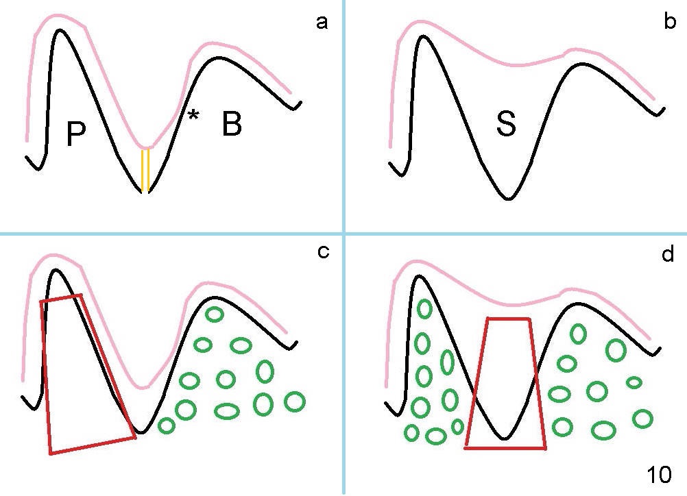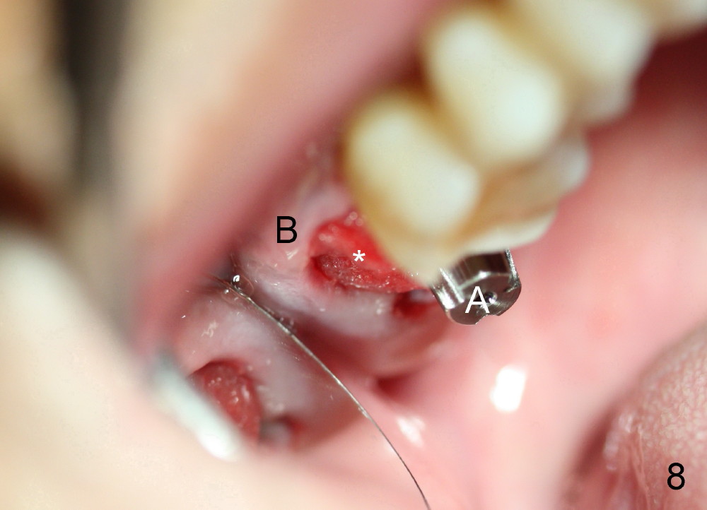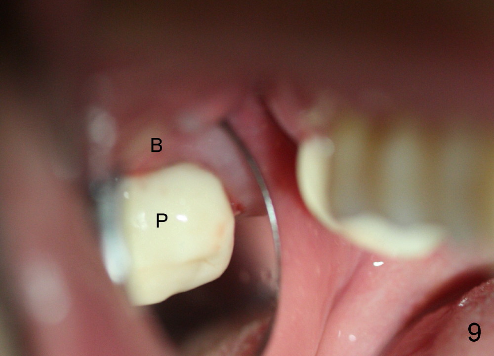 The buccal socket (Fig.3 B) is large and shallow (difficult to achieve primary stability of implant); the palatal wall of the buccal socket is apparently thin (greyish *). The most critical is that the buccal plate of the buccal socket is low (Fig.10a).