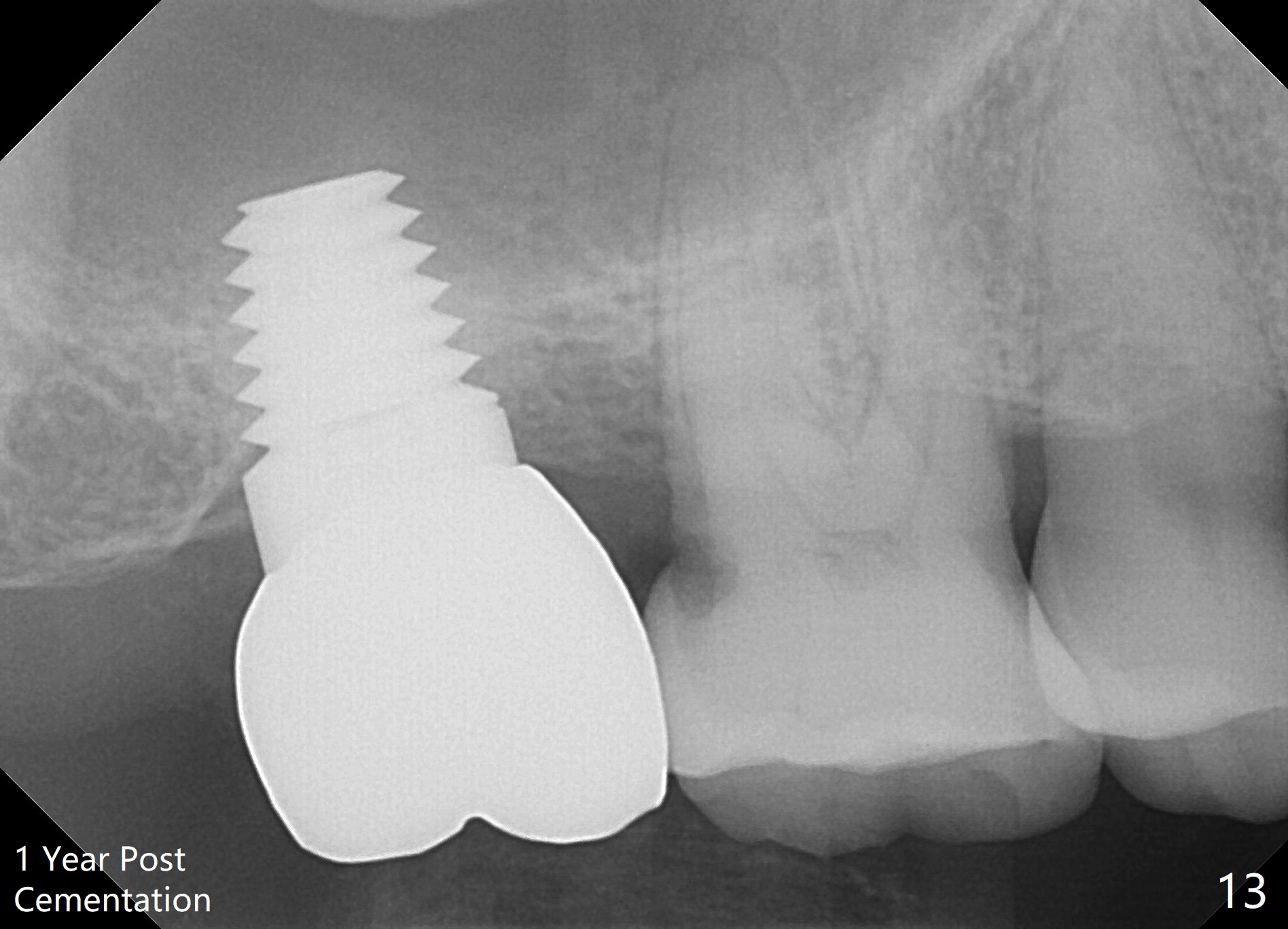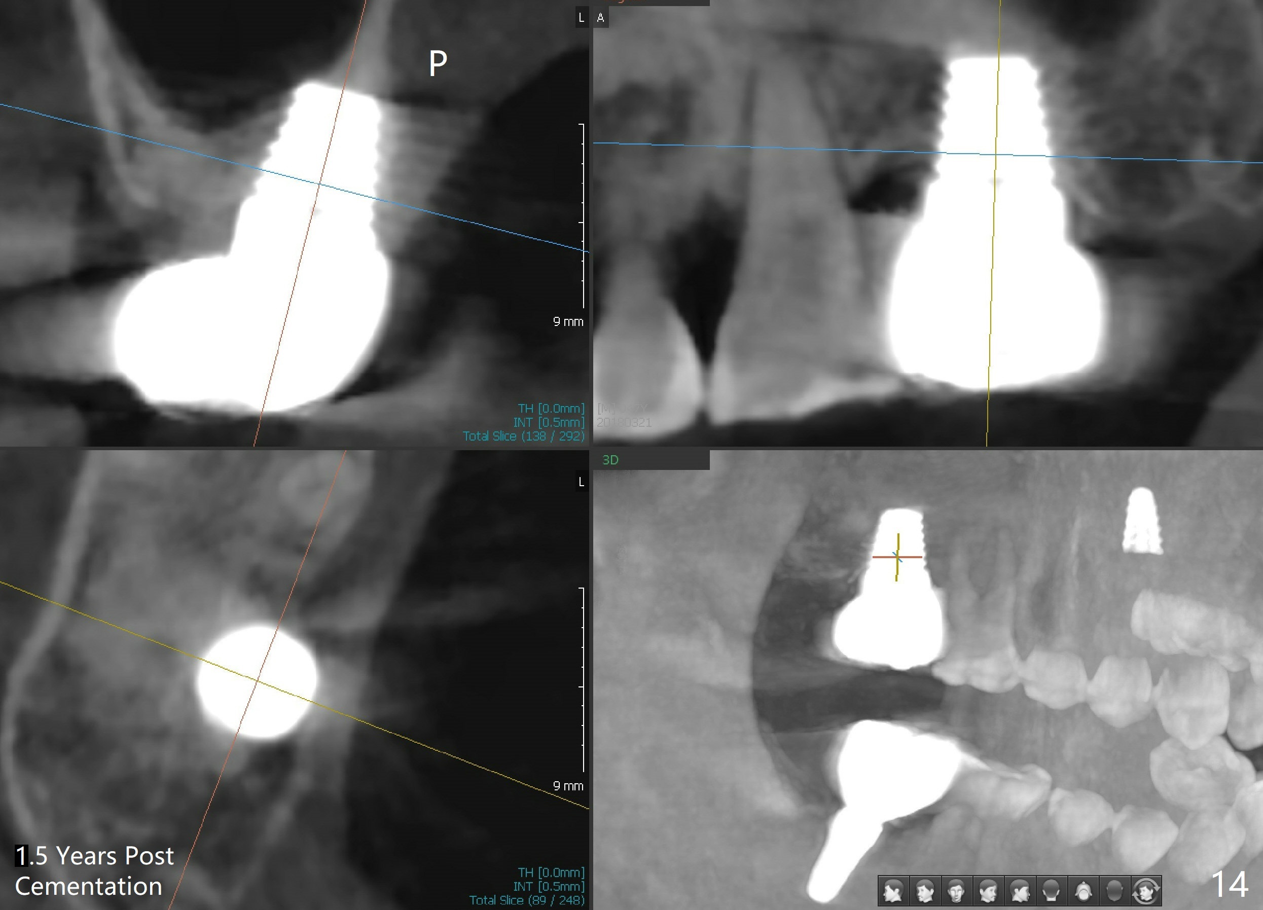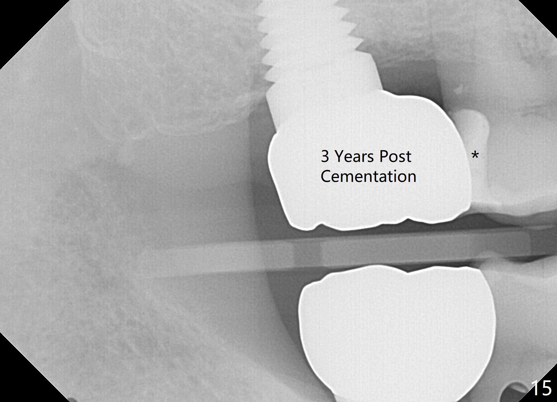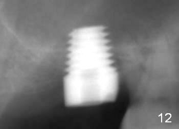 The patient returns for final restoration 22 months postop (Fig.12). Implant threads are embedded in the bone. Panoramic X-ray is taken after removal of perforated provisional and abutment. The implant remains asymptomatic 1 year post cementation (Fig.13) in spite of the fact that there appears to be no palatal plate (Fig.14 (1.5 years post cementation)). It is probably related to the thick palatal (P) gingiva. Periimplantitis develops 3 years post cementation and immediately post #15 implant 2nd removal. The implant is found to be palatal when #3 DO composite is placed (Fig.15). Oral hygiene appears to be difficult to maintain in spite of use of water pik. His diabetes is under control with Insulin.