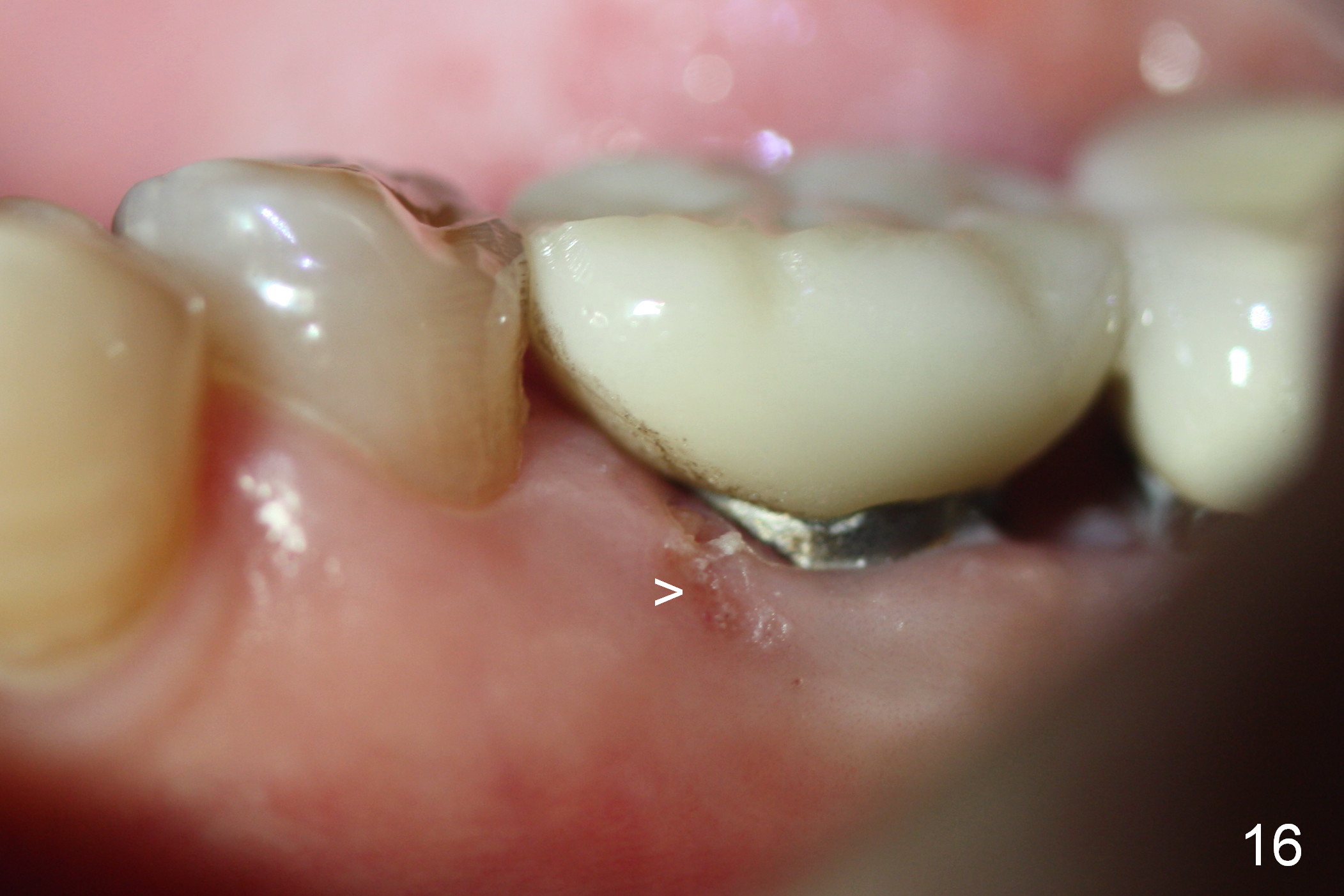 The patient returns for provisional recementation 1.5 months postop. The gingiva remains infection free (Fig.12), but the socket at the implant site has shrunk as compared to the 2nd molar site (Fig.13 arrowheads). Therefore, an implant should be placed before the socket shrinks post extraction, especially with preop lesion. Socket preservation does not prevent socket collapse. The implant is the best framework (tenting) for bone regrowth.