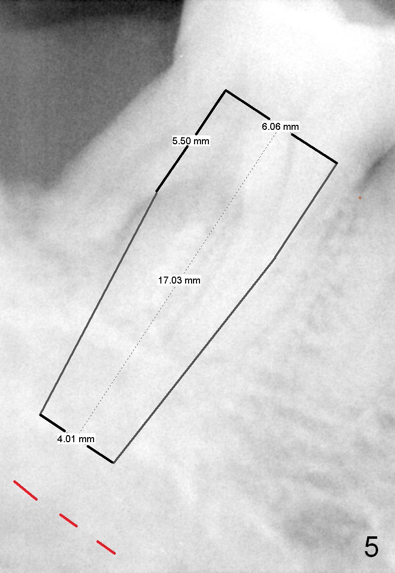 Fig.6 is an illustration after extraction (S: septum; M: mesial socket).  Osteotomy is initiated with a pilot drill in the distal aspect of the mesial socket or the mesial aspect of the septum (Fig.7).  The osteotomy is enlarged with osteotomes; at the same time the septum is being pushed distally (Fig.8 blue arrow) with leaning the osteotomes distally (white arrow).  When an implant is placed, the apex is mainly seated in the mesial socket, while the coronal end is more or less inclined distally for restoration.  The apical half of the distal sockets is packed with collagen plug or dressing, whereas the remaining sockets and coronal exposed threads are filled with bone graft (Fig.9,10 red circles).  An incision is made if needed for better visibility.   The most coronal socket is going to be obliterated by a cemented or healing abutment.  Does the treatment planning help surgery?