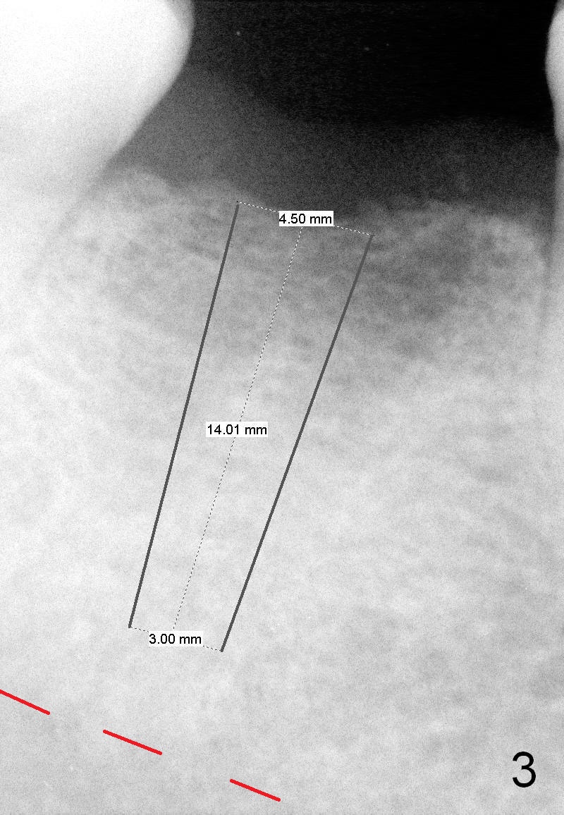 A 52-year-old lady has lost #30 for several years, but the socket outline persists with low bone density (Fig.1 (trimmed from panoramus),2). Osteotomy should be underprep. Bone height allows to placement of a 14 mm implant (Fig.3). Still initial depth will be 12 mm.