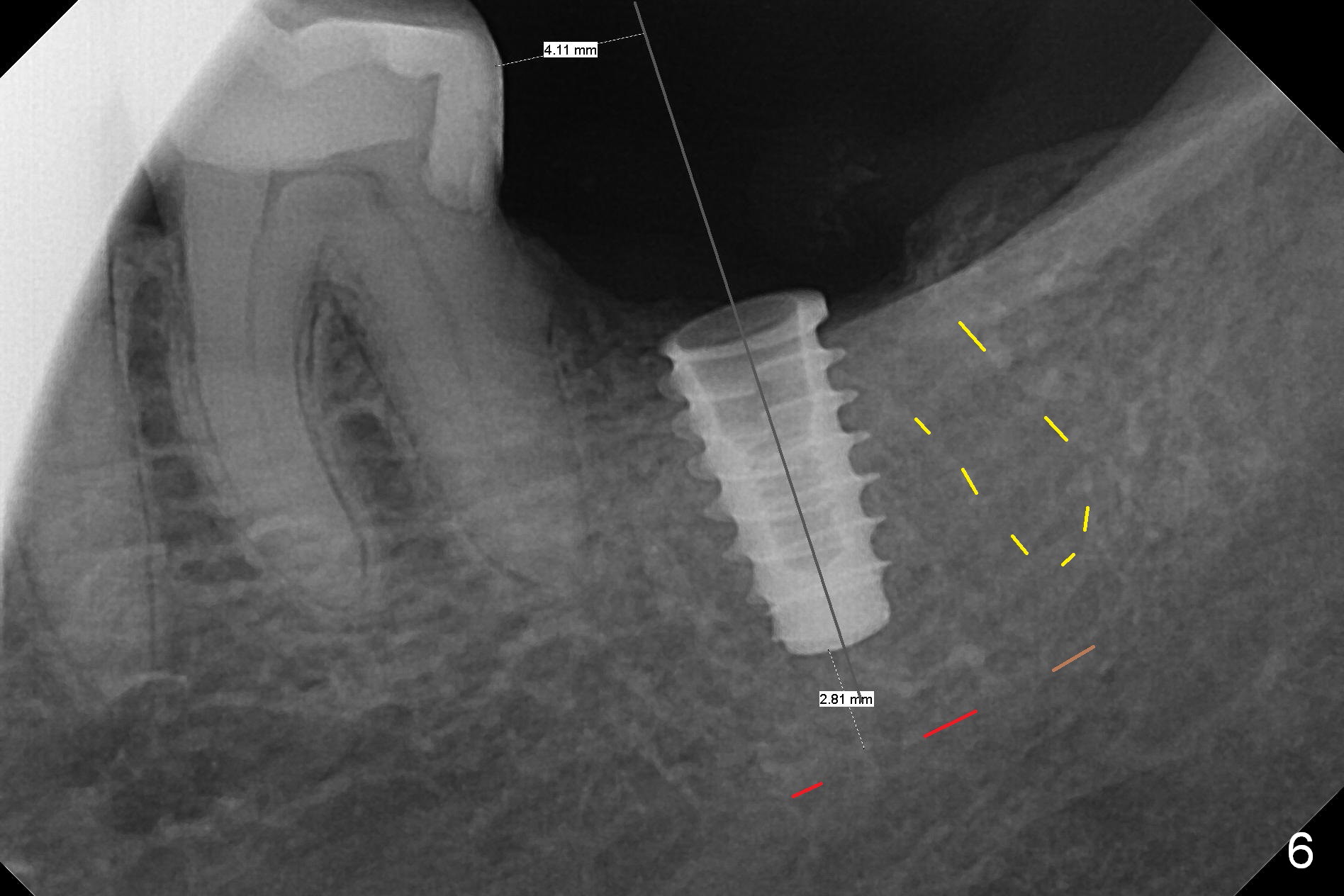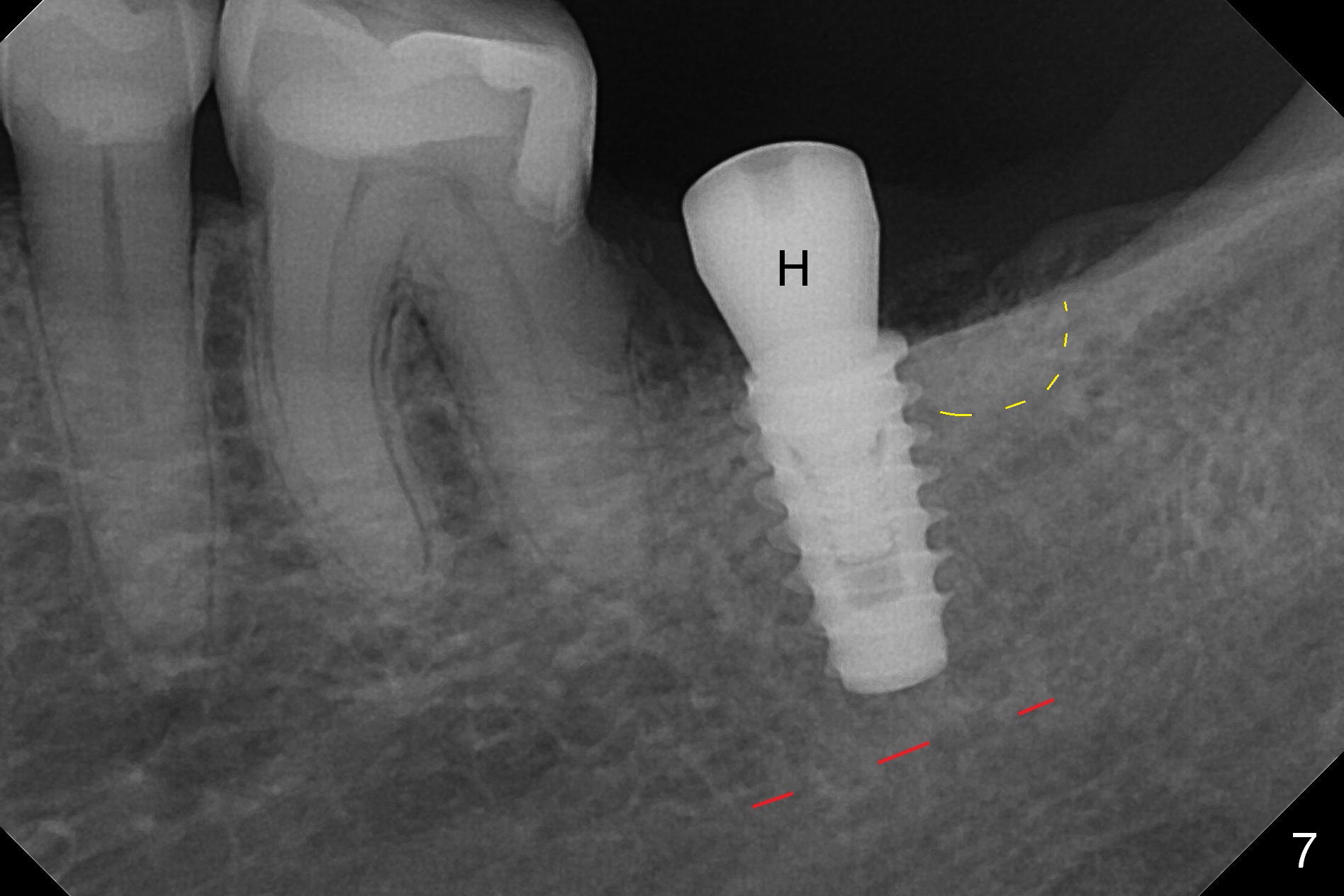 Preop palpation of the edentulous area at #18 does not show the flatness of the ridge top as shown by CBCT.  Incision reveals that the ridge is not as wide as CBCT indicates (Fig.1 (coronal section) between arrowheads).  In fact the ridge is concave (Fig.2 red dashed line).  Osteotomy is initiated in the middle of the concavity (Fig.2 green line) with insertion of 7 mm guide pin (Fig.3).   After removal of the pin, the osteotomy is moved buccally (Fig.4).  After Marking Bur and 4.3 mm Magic Drill, a 5x9 mm IBS implant is placed with 2.8 mm clearance from the Inferior Alveolar Canal (Fig.6).  Following deepening the osteotomy with Final Drill, the implant is placed deeper (Fig.7).  The osteotomy happens to be established in the mesial socket, since the distal socket has not completely healed (Fig.6 yellow dashed line).  Granulation tissue is removed.  Since the lingual crest is lower than the buccal one (Fig.1 B), there is lingual thread exposure after implant placement (Fig.5).  The exposed thread is covered by bone graft (autogenous bone, allograft and Osteogen, Fig.5 pink circles).  Some of the graft is apparently pushed into the distal socket (Fig.7 yellow dashed line) post GBR and suture.  As the implant is placed twice, insertion torque is <10 Ncm (although the implant is stable).  A 5x3 mm healing abutment is placed (Fig.7 H).