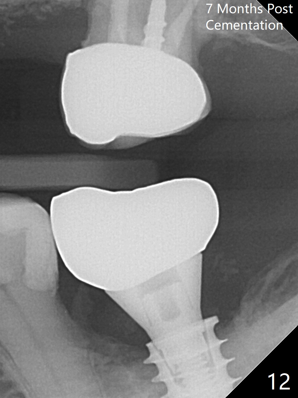 There is no apparent bone loss 4 months postop (Fig.10).  There is chewing pain in spite of occlusal adjustment 7 months post cementation (Fig.11-13: increased radiolucency around the implant).  The crown/abutment is removed and a healing abutment is placed (6x3 mm); the implant is stable.  The patient return for re-evaluation in 3 months (15 months postop); radiolucency appears to reduce (Fig.14).  But there is pain when the healing abutment is being removed.  After local anesthesia, the implant is removed with a wrench.  Following debridement of the osteototomy (intact, although tender), a 5x10 mm dummy implant with SLA surface is placed (Fig.15).  After 5.5 mm tap, a 5.5x8.5 mm implant is placed with >50 Ncm (Fig.16).  A 6.8x5 mm healing abutment is placed, followed by periodontal dressing.  Re-analysis of preop CBCT shows that the bone density at the site is low: 70 units average.  Progressive loading is necessary for this case 4-6 months postop.  The soft and hard tissues around the implant seem to heal 4 months postop (Fig.17).