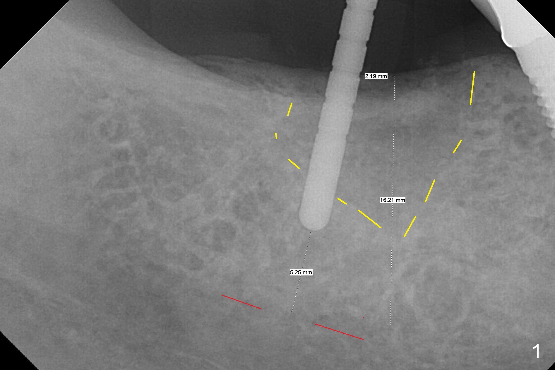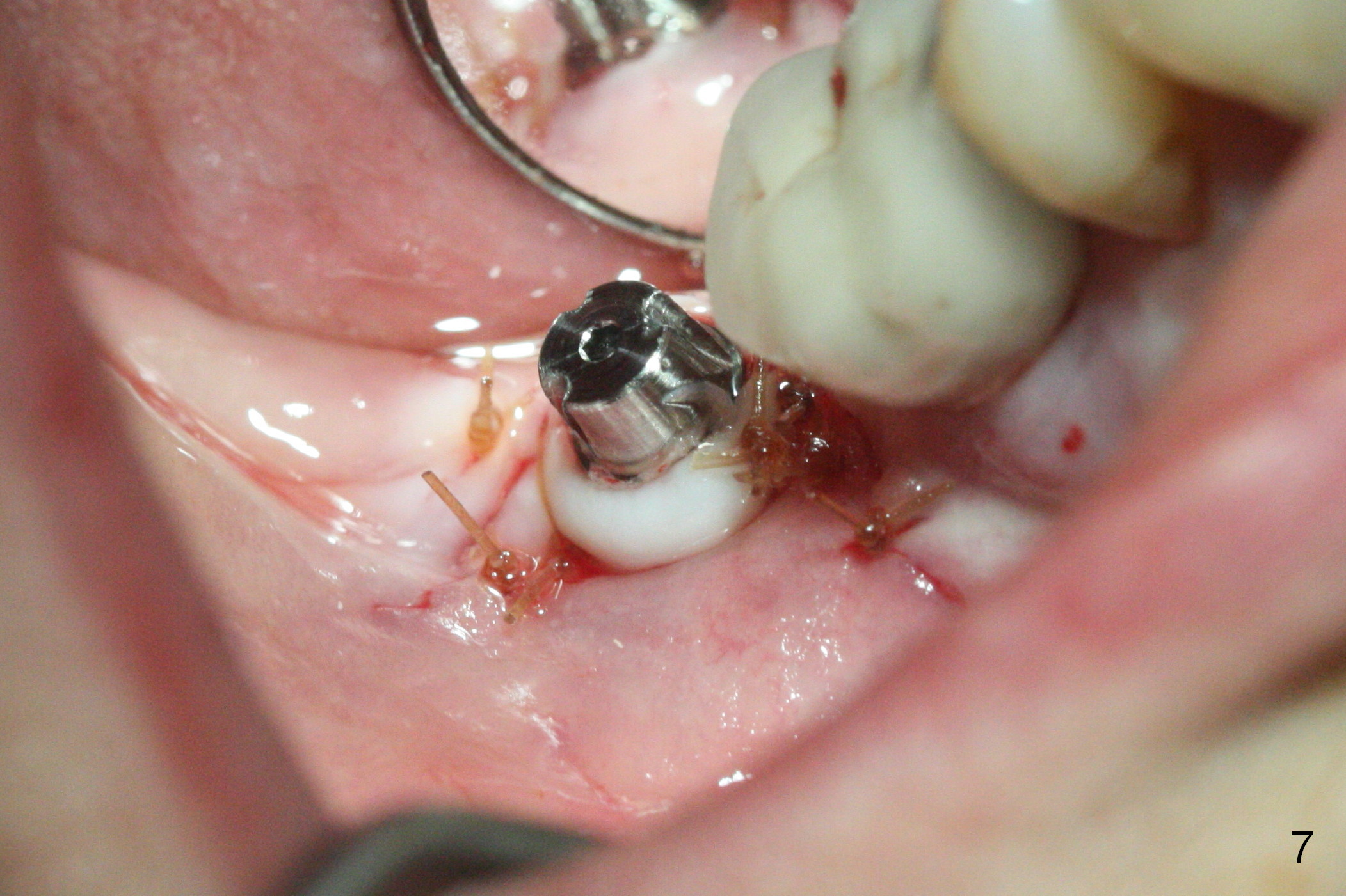 Initial osteotomy at the site of #31 using 2 mm pilot drill for 11 mm appears to be distal by 2-3 mm (Fig.1, Fig.10 A (circle, occlusal view of the edentulous and dentate (#29 and 30) areas)). Lindamann bur is used to move the osteotomy (Fig.8 white rectangle, Fig.10 B). It seems that the osteotomy returns distal as the osteotomy increases (Fig.2 (5x17 mm tap), Fig.8 arrow, Fig.10 C (green circle)). It appears to be late to change; a 5x17 mm tissue-level implant is placed with > 60 Ncm (Fig.3-5). The buccal and lingual rough surface of the implant (Fig.5 *) is covered by autogenous bone/Osteogen and Collagen Dressing (Fig.6 *). After suturing (Fig.7), periodontal dressing is applied around the abutment (Fig.5 A (4.5x3 mm)).
