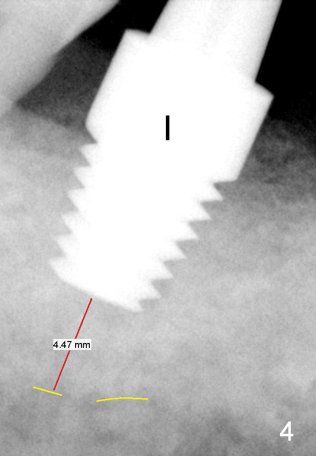 The implant remains stable 5 months postop (Fig.7). Apparent new bone is forming toward the distal coronal threads (between arrowheads).