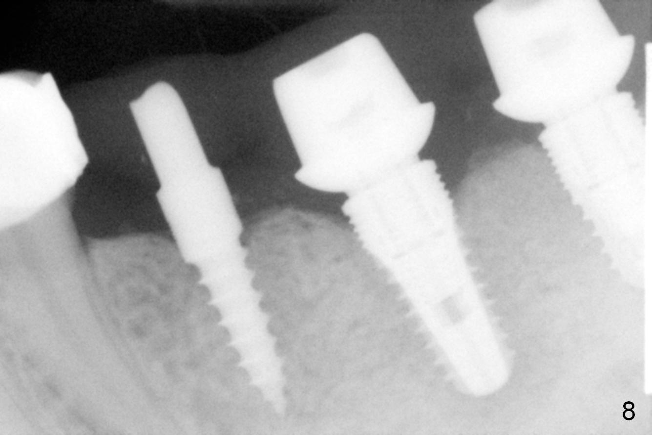 The patient is doing well postop, but 1 month postop, she complains of pain in the left submandibular area. When the immediate provisional is removed, the gingiva between the implants is erythematous (Fig.5 ^). The provisional is modified with accentuated grooves between the margins of the implants (Fig.6 *) with oral hygiene instruction. In fact the provisional is not cemented so that it is easy for self cleansing. There is crestal bone resorption 3 months postop (Fig.7,8). No further bone loss 1 year post cementation (Fig.9, cropped from pan). The bone density around the implants increases 2 years 8 months post cementation (Fig.10).