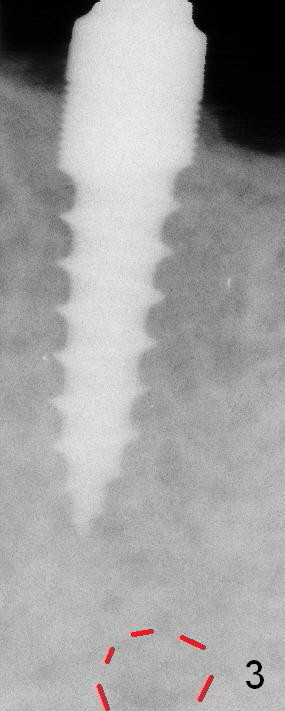 Immediately (Fig.3,4) and 3 months (Fig.8) post placement of 3x11 mm 1-piece implant at #20 (Fig.3) and 4.5x10 and 4.5x8 mm implants at #19 and 18, respectively.