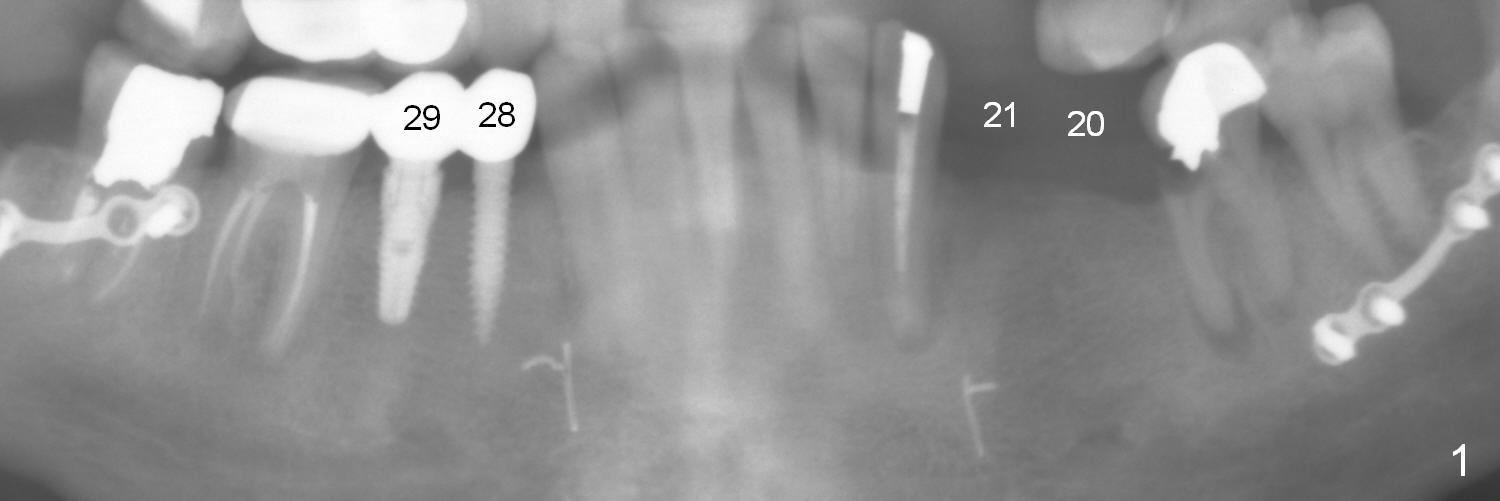 A 39-year-old man is pleased with implant placement at the lower right premolars (Fig.1: #28,29). He wants to have the same treatment at the lower left (#20,21), although the neighboring teeth need more urgent treatment. CBCT coronal sections at #21 (Fig.2) and 20 (Fig.4) show that the crest at the 1st premolar is particularly narrow and pointed. Since the Mental Foramen is at the 2nd premolar (arrowhead in Fig.4, 6 (sagittal section)), it seems appropriate to resect the atrophic crest by 6-7 mm at #21 (Fig.3 black area) and place a narrow implant low. It may invade the Incisive Nerve (Fig.7 brown cicle), which should be insignificant. A long abutment is expected at #21. A regular implant and abutment are expected at the 2nd premolar, similar to the right side. Smaller implants may be more appropriate (3.8 mm) to reduce postop bone resorption. In fact, the patient cracks the tooth #31. It seems to be nonsalvageable. In fact, what is to be done?