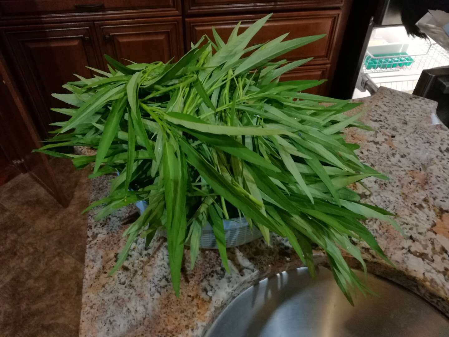 亲爱的妈妈:这是今年第二次收获的空心菜。我们州不允许种空心菜,但是福州人敢在中国超市外面卖。我们买了,下面部分进行培育,种在后院。我爸说自己种的很嫩。空心菜是我母亲最爱吃的菜。